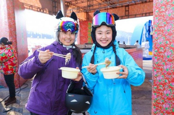 沈阳市公安局冰雪巡逻队手持国旗,飒爽指引活动大旗顺雪道冲浪而出。红色旗帜在皑皑白雪中形成壮丽图景,象征着辽宁文旅的蓬勃活力与开放姿态。直径达3米的超级酸菜大火锅热气蒸腾,以极具地域特色的美食盛宴款待远方来客,传递着辽宁人的豪爽与热情,成为仪式上最具话题性的文化符号。
