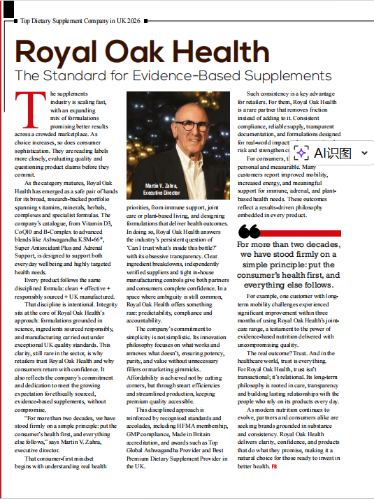在这一趋势下,Royal Oak Health 依托研究驱动的产品体系、严格的英国制造标准以及长期积累的消费者信任,在多项评估维度中获得较高评价,最终从众多候选品牌中脱颖而出。