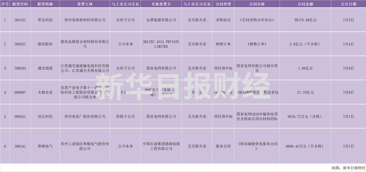 2月7日,苏州工业园区和顺电气股份有限公司发布公告,公司与中国石油集团渤海钻探工程有限公司签订《移动储能供电服务合同》,为钻井作业现场提供电力供应服务。合同服务期限自签订之日起至2028年12月31日止,预计金额6000.45万元(不含税)。合同的顺利履行预计将对公司2026年度及未来年度经营业绩产生积极影响。