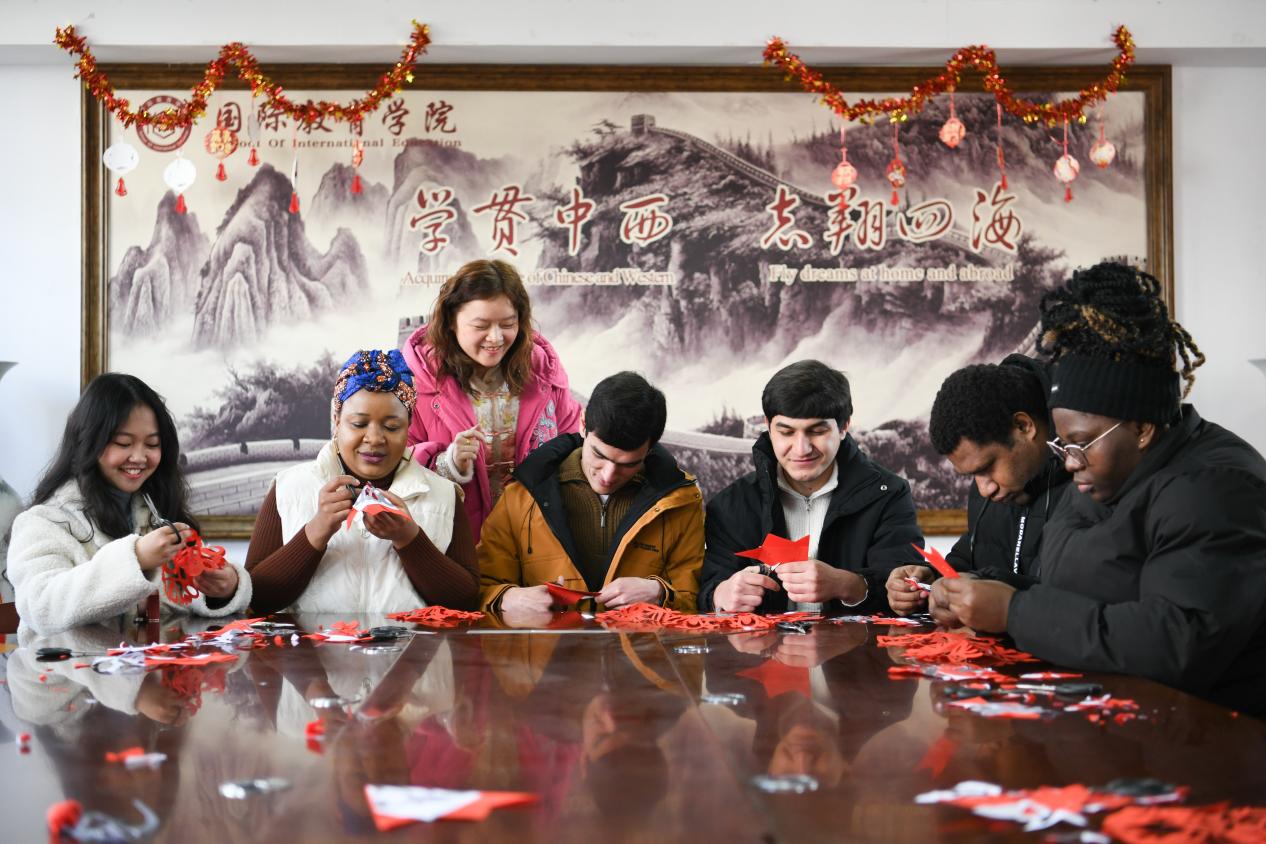 剪纸体验区,马年主题的剪纸模板一应俱全,留学生们在老师指导下剪出奔马窗花,将新春美好祝愿融入手作之中。