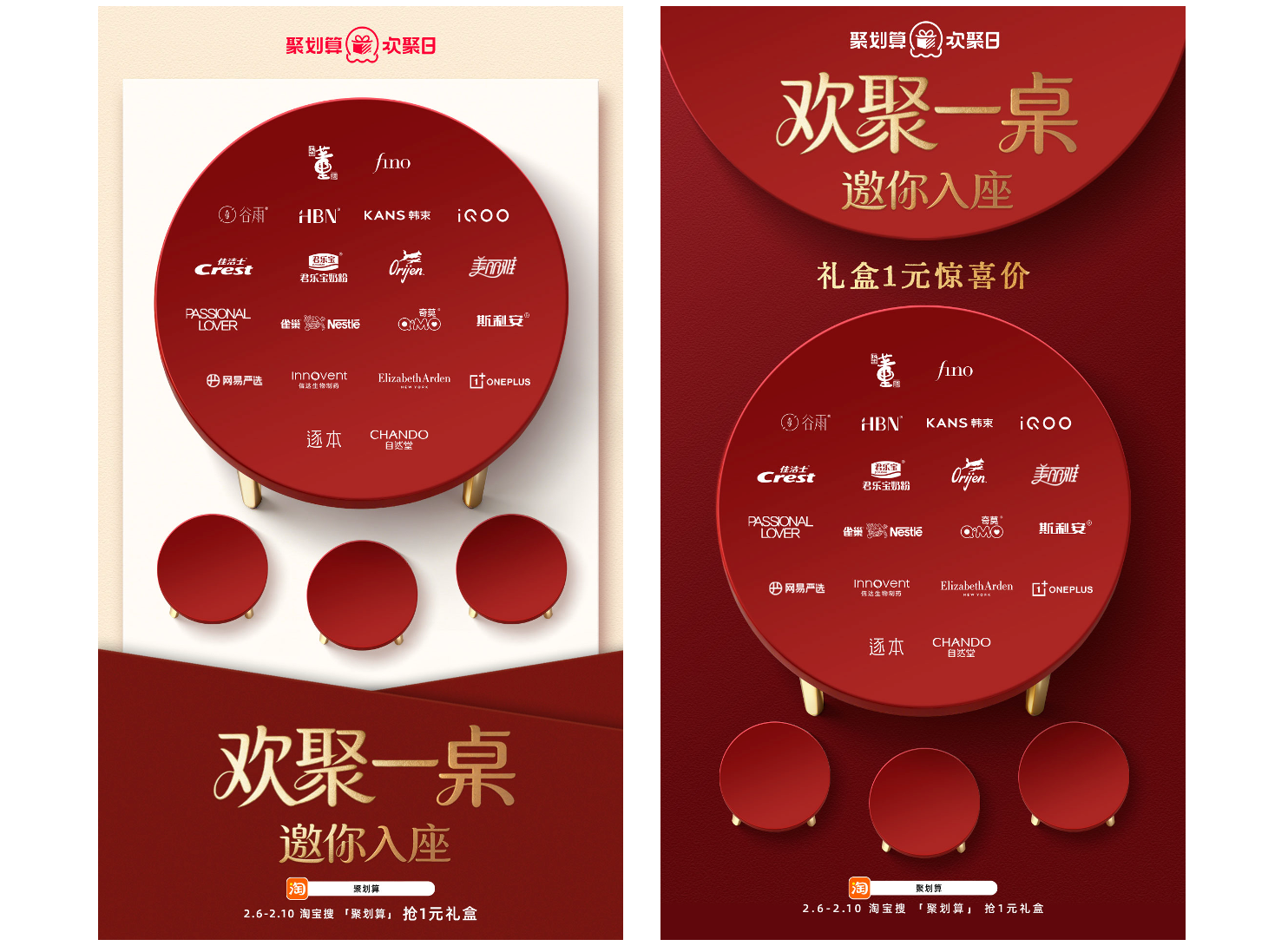 圆桌,是中国家庭文化和饮食文化中都极具代表特色的象征,围桌而席,一个圆心让桌边的家人、客人能够面向交谈,热聊家长里短,尤其在春节、中秋等重要节日,一家人围坐圆桌共享年夜饭或团圆饭,强化了亲情纽带和家庭凝聚力,在聚划算欢聚日的春节特别企划中,品牌通过中式圆桌为概念,携手欢聚日的长线合作伙伴,邀请大家一同入座,感受春节的欢聚气氛、体验商家推出的惊喜活动,让品牌表达非常生动地展现出来。