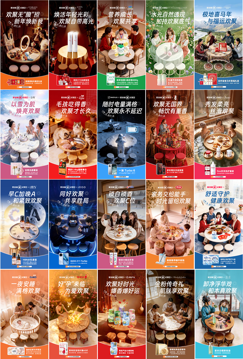 今年的春节特别企划中,聚划算欢聚日也联合挚友品牌,用创意表达和品牌联动大事件,让「欢聚一桌 邀你入座」的主题更加丰富,让“欢聚桌”从节日的饭桌延伸到更多欢聚空间,这些欢聚空间与品牌特色相融入,既成为了商家表达自身个性的出口,也加强聚划算欢聚日作为一个“品牌欢聚大舞台”的角色感,让这种双向奔赴更加可知可感。