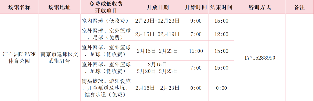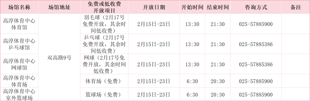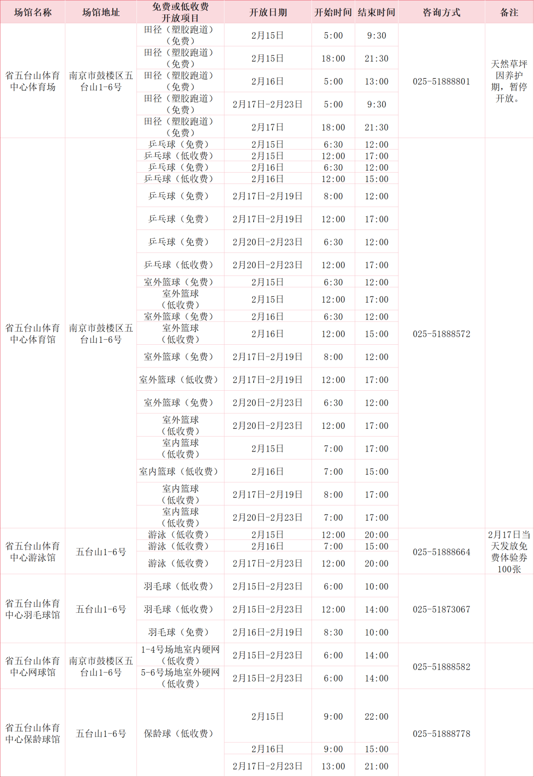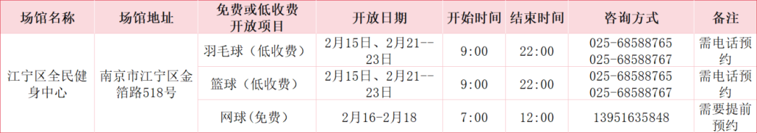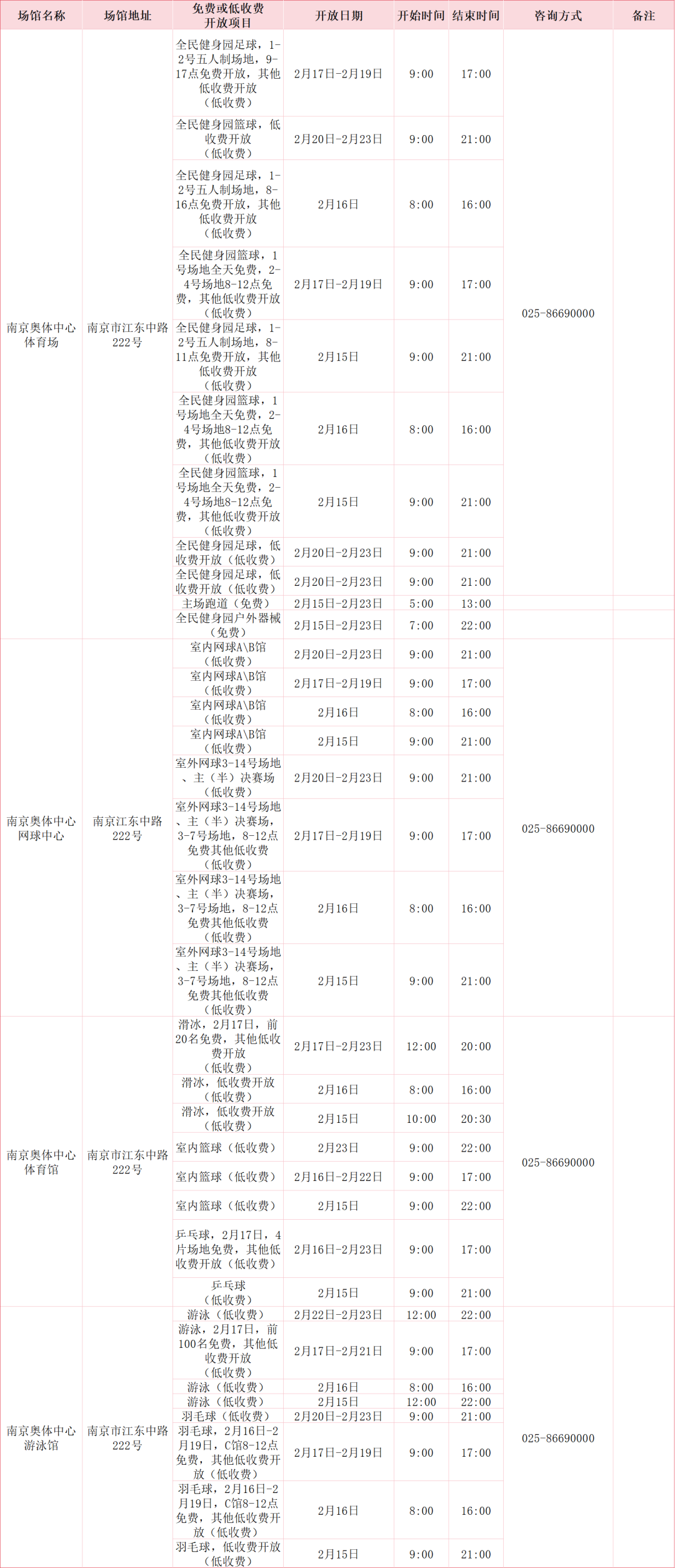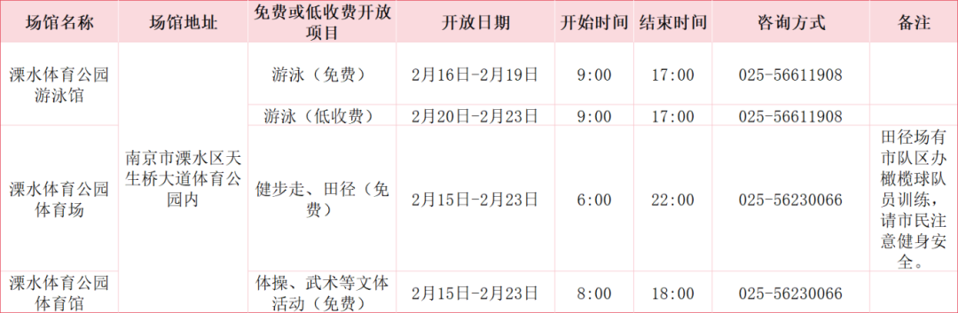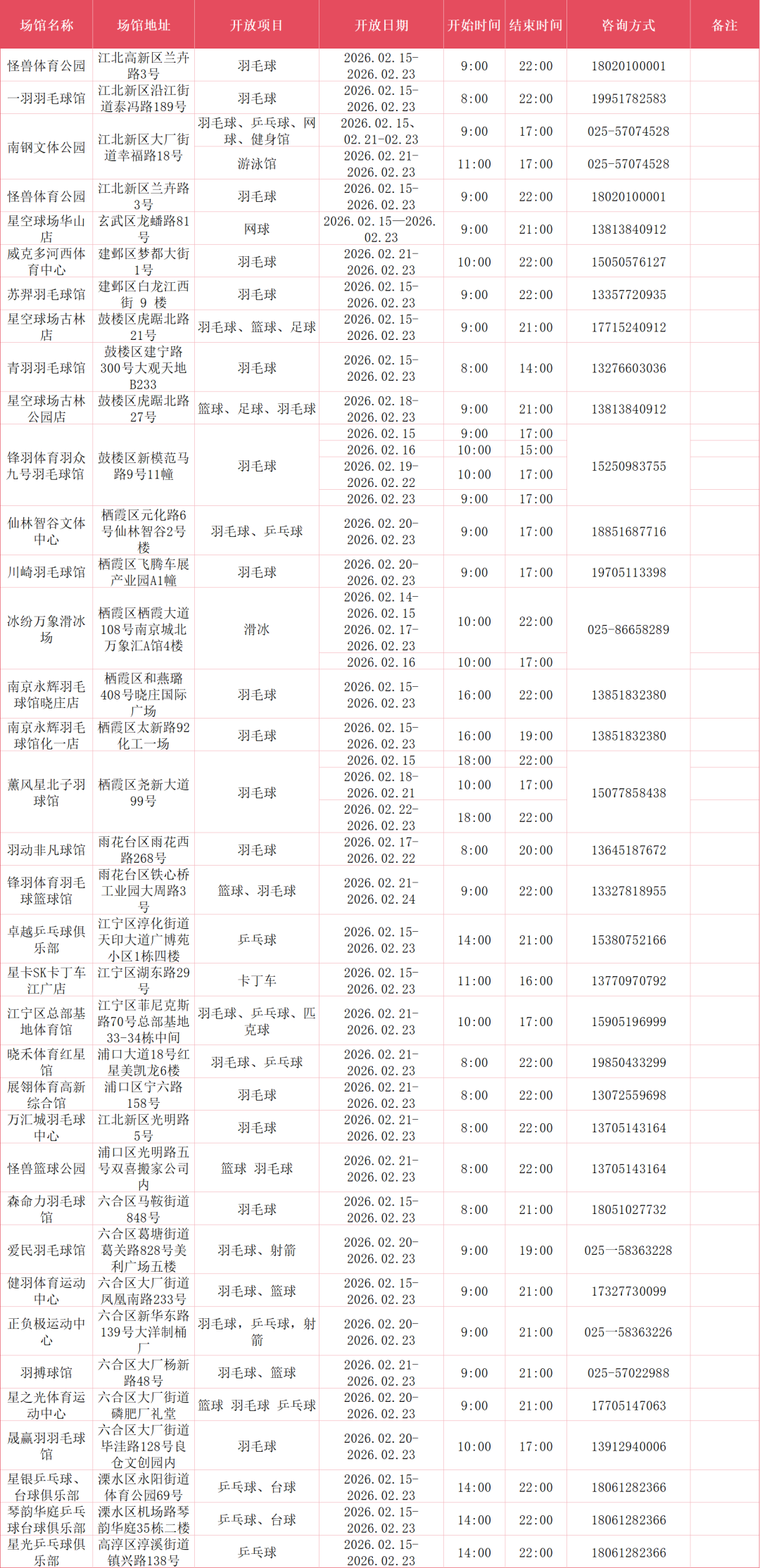 温馨提示:本公告提供的开放信息仅供参考,受春节假期场馆运营调整影响,各场馆具体开放时段、优惠细则及预约要求以自身实际安排为准。建议广大市民提前通过场馆官方公告、咨询电话或“宁体汇”线上平台查询详细信息,合理规划健身行程,提前做好预约准备;健身期间请自觉遵守场馆管理规定,爱护场馆设施设备,共同维护安全、有序、文明的健身环境,度过一个健康、欢乐、有意义的新春佳节。