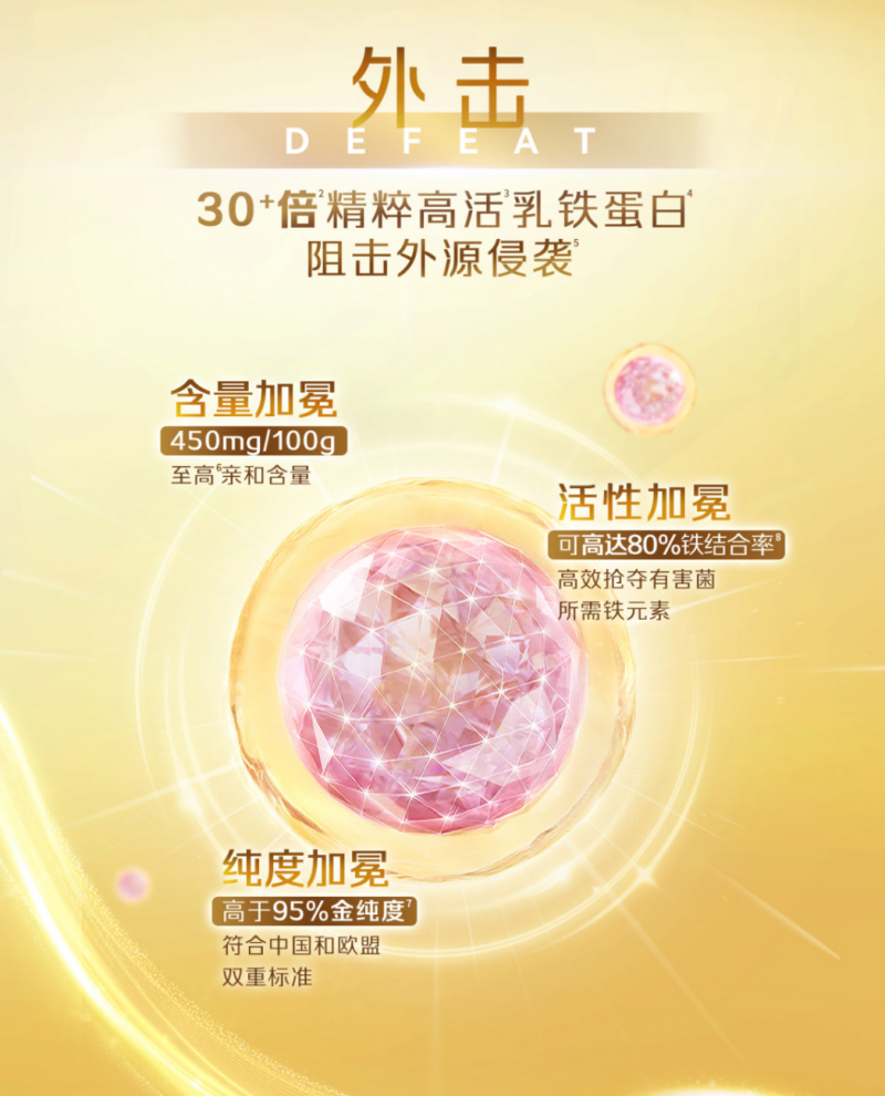 在对外进攻方面,皇家美素佳儿凭借至高科学含量的乳铁蛋白,精准对抗坏菌,筑牢宝宝体质防线。乳铁蛋白作为母乳中的全能ACE,被誉为免疫奶黄金,能主动抵御坏菌,是守护宝宝的实力担当,帮家长轻松养出“铁打娃”。皇家美素佳儿每100g奶粉中乳铁蛋白含量高达450mg,可为宝宝提供贴近源乳的保护力,更关键的是,这个含量精准契合《乳铁蛋白临床应用中国专家共识》中婴幼儿200-800mg的建议摄入量,无需额外补充就能一次到位。它还以超95%的金纯度搭配80%+的高活性,将乳铁蛋白的保护力发挥到极致,主动“赶走”外界“小怪兽”,为宝宝长效抵御外界侵扰。