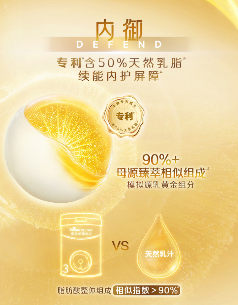 内在防御层面,皇家美素佳儿搭载90%+贴近源乳的专利天然乳脂配方,为宝宝构筑妈生级内在防御屏障。这款持证上岗的专利配方,精准贴合母乳脂肪结构,更适配宝宝娇嫩肠道,搭配近40种天然乳脂保护因子,能进一步稳固宝宝内护屏障,让宝宝更抗造,助力缓解转奶期常见的消化不适等问题。