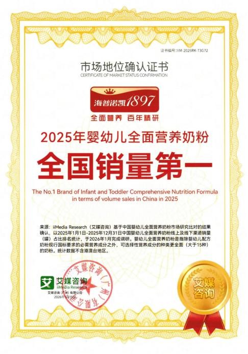 近日,高端婴配粉领域传来喜讯,海普诺凯再添亮眼佳绩:三度蝉联“2025婴幼儿全面营养奶粉全国销量第一”,并斩获全球权威机构认证“中国全面营养婴配奶粉开创者”称号。这份荣誉既是品牌口碑和实力的有力印证,更是品牌持续深耕高端婴幼儿奶粉领域,坚守“全面营养 百年精研”理念的生动注脚。旗下核心产品海普诺凯1897荷致,凭借母源全面营养的超高品质,为中国宝宝提供适配天生所需的营养支持,成功俘获众多母婴消费者的心。