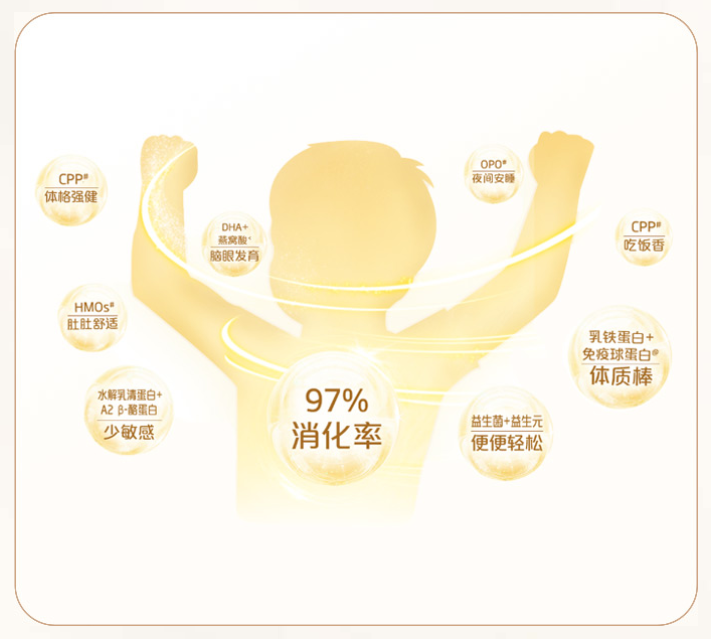 海普诺凯1897荷致,以母源营养结构为参照,依托海普诺凯百年科研成果持续迭代升级,聚焦宝宝营养消化吸收与自护力构建,打造全面营养守护体系。产品采用荷兰专利A2β-酪蛋白+OPO组合,有助于温和营养更好消化易吸收,不给宝宝肠胃添负担,助力宝宝营养吸收好,长高长肉、成长更给力。对于生长发育期的小宝宝而言,亲喂中的活性自护营养是体质的“天然保护盾”,荷致有高量乳铁蛋白、5种母乳低聚糖HMOs、免疫球蛋白IgG、乳源燕窝酸和9:1益生元+益生菌,构建全面自护营养群,由内而外激发宝宝身体自护力,筑牢健康体质好基础。同时,配方中优化添加水解小分子蛋白+生物活性肽CPP,进一步提升关键营养吸收率,让每一份营养都能充分转化为宝宝的成长动力,全面护航宝宝茁壮成长。