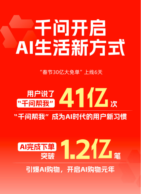 2月12日,千问发布的“春节30亿大免单”第一波活动数据显示,过去6天,用户说了41亿次“千问帮我”,AI完成下单超1.2亿笔,在全球首次实现AI Agent的大规模真实世界任务执行与商业化验证,成为AI发展史上的一个里程碑。