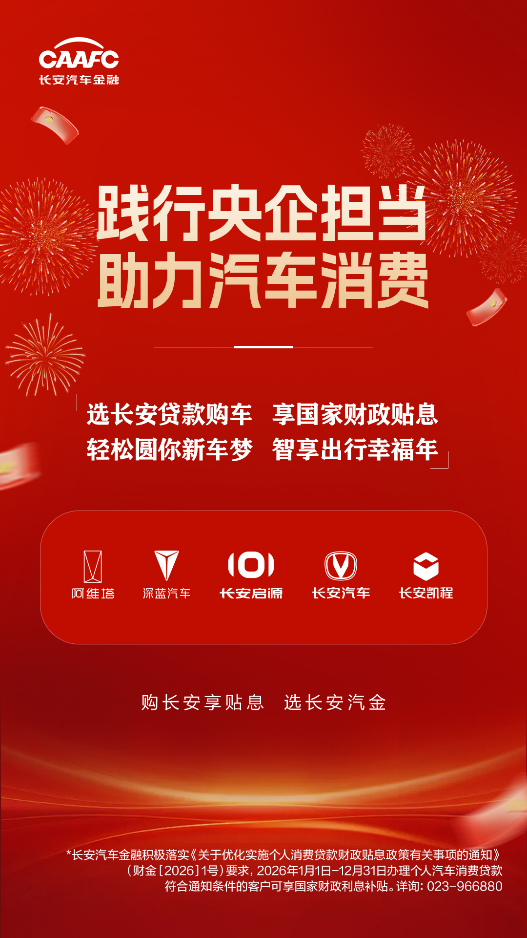 据了解,2026年1月1日至12月31日,符合条件的个人汽车消费贷款客户,均可通过长安汽车金融享受国家财政利息补贴,以金融服务助力民生消费。此外,长安汽车金融还同步推出长期限金融产品,为阿维塔、深蓝汽车、长安启源等多款车型提供灵活融资方案,全方位满足消费者的多样化需求。
