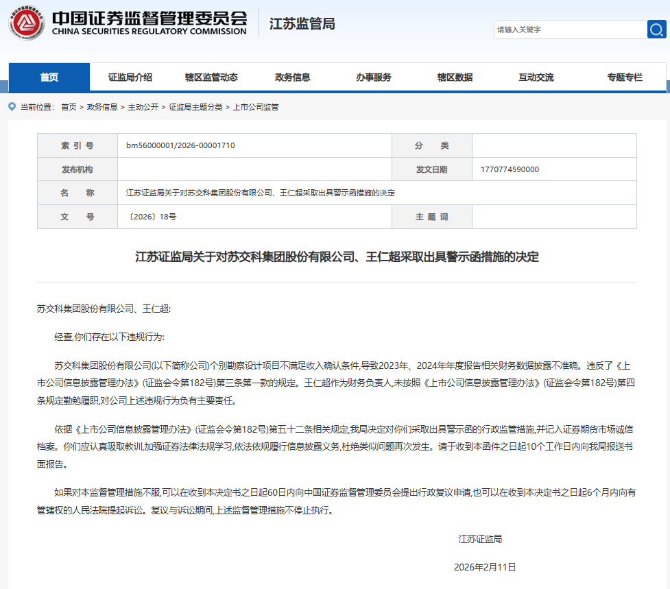新华日报财经讯 2月11日,深圳证券交易所同日下发两份监管函,直指苏交科集团股份有限公司(300284.SZ)在财务信息披露与股东合规运作层面的双重违规。就在前一日(2月10日),江苏证监局已对相关主体作出行政监管措施决定。这意味着在不足24小时内,苏交科及其财务负责人、两位持股5%以上大股东被监管层密集点名。叠加公司1月29日披露的2025年度业绩预告“2025年度归母净利润为2100万元至3000万元,较上年同期下降86.80%至90.76%”。这家国内工程咨询行业首家A股上市公司正面临上市以来罕见的合规与经营双重高压。