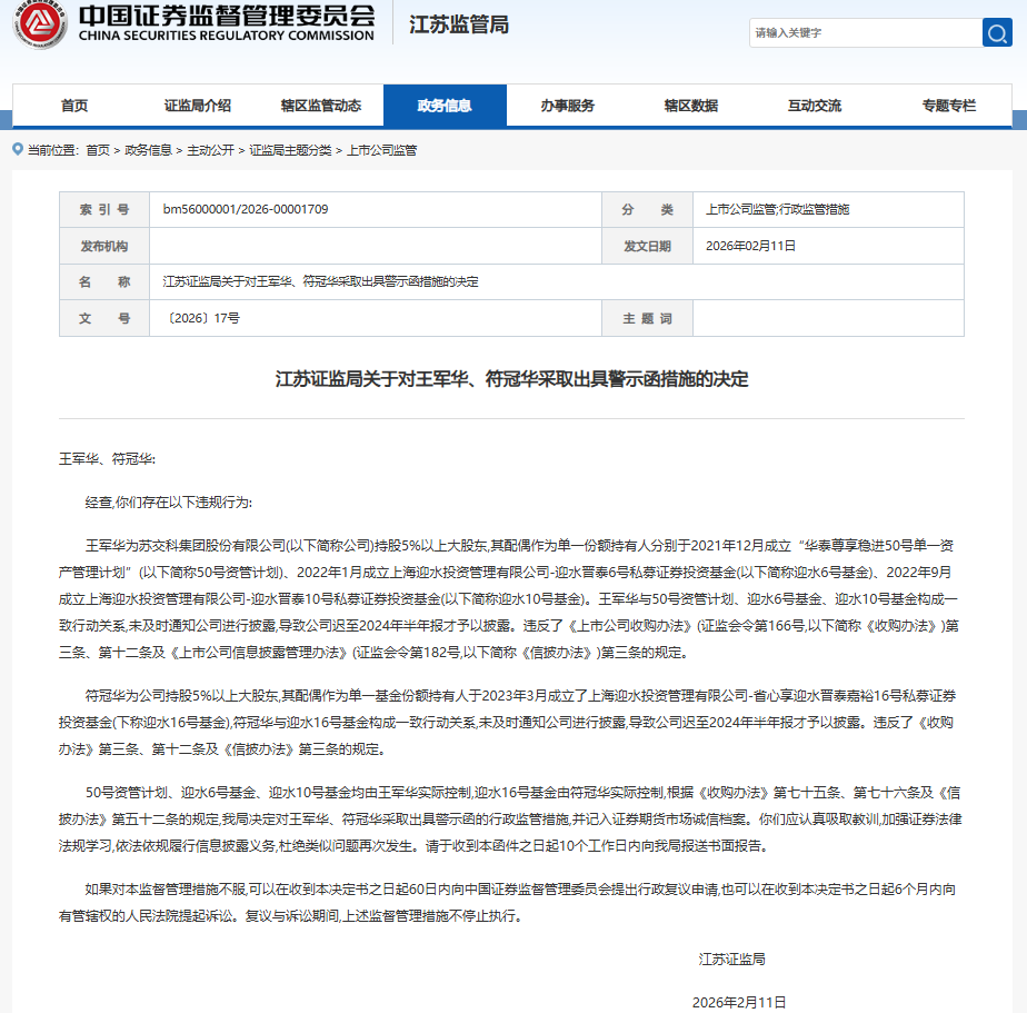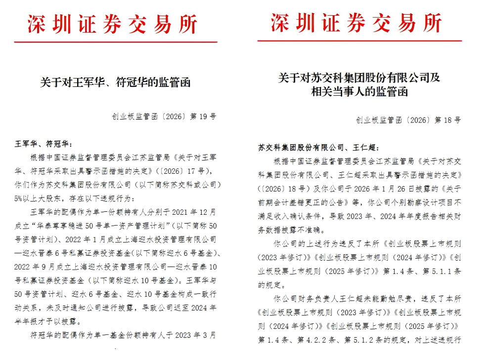 同日,江苏证监局发布〔2026〕17号决定,对公司前董事、持股5%以上大股东王军华,以及名誉董事长、持股5%以上大股东符冠华分别采取出具警示函的行政监管措施,同样记入诚信档案。据江苏证监局披露,深交所同步对二人下发创业板监管函(〔2026〕第19号)。