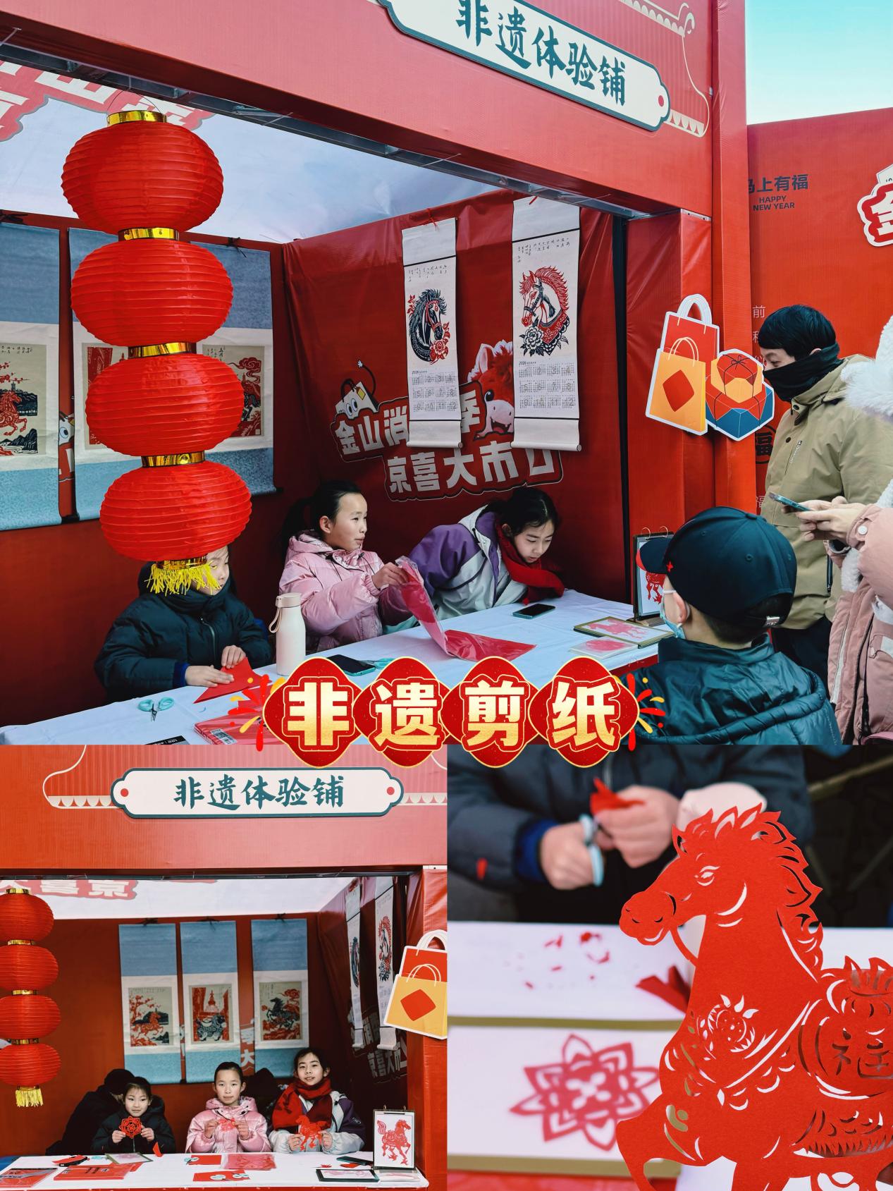 市集还设立了丰富多彩的非遗文化体验区:书法老师现场挥毫送“福”,笔墨寄情;非遗剪纸巧手生花,展现精妙图案;吹糖人师傅手下生灵,栩栩如生。此外,悠扬的乐队现场弹奏更添节日雅趣,传统与现代音符交织,营造出浓浓的文化新春氛围。