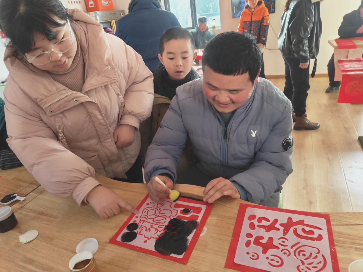 活动现场红纸铺展、墨香四溢,充满了浓厚的节日气息。在书法志愿者的指导下,老少参与者一同挥毫,书写吉祥对联与“福”字。小学生们主动协助铺纸、晾晒春联,并以童真笑语陪伴在场残疾人朋友。此外,活动还设置了拓福字、“马上有钱”等趣味体验环节,在志愿者的耐心指导下,大家动手体验传统拓印工艺,现场笑声不断,年味十足。