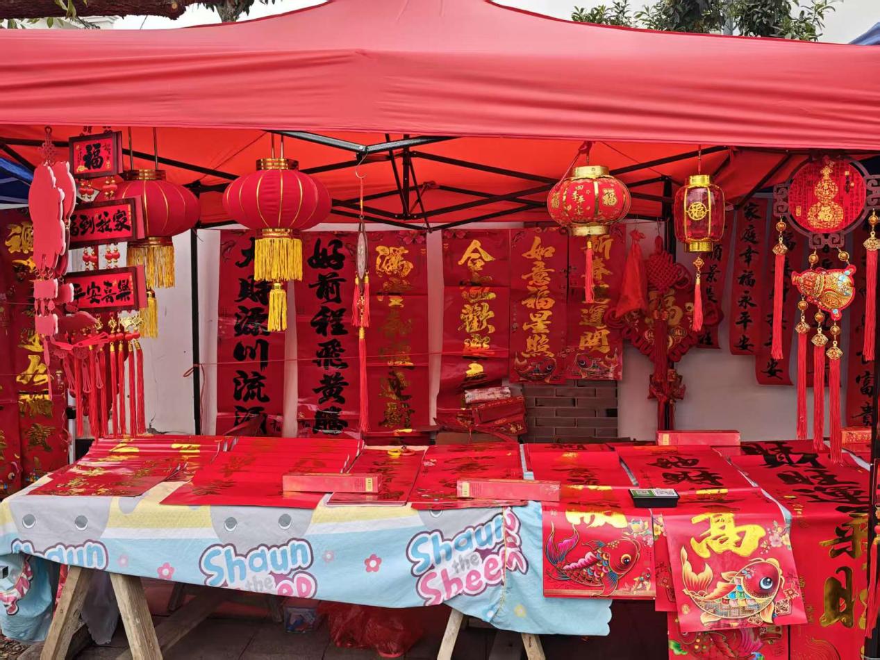 汤泉的新春摊位集市上,大红春联、福字窗花整齐铺展,满目皆是喜庆红。往来行人驻足挑选、笑语连连,尽是最地道的新春年味。