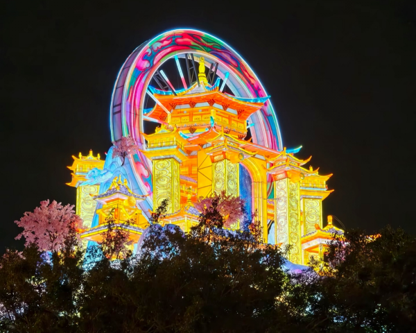 其中,位于核心水域的“桃海仙踪”水上灯组成为全场焦点。该灯组总长度超220米、高约25米,整体尺度相当于三座标准足球场首尾相连,是目前国内罕见的超长水上灯组之一。夜幕降临后,灯组与水面倒影相互映照,形成横贯水域的光影长卷,成为“欢乐光域”最具标志性的视觉中轴,也进一步夯实了本届灯会“省内最大”的规模定位