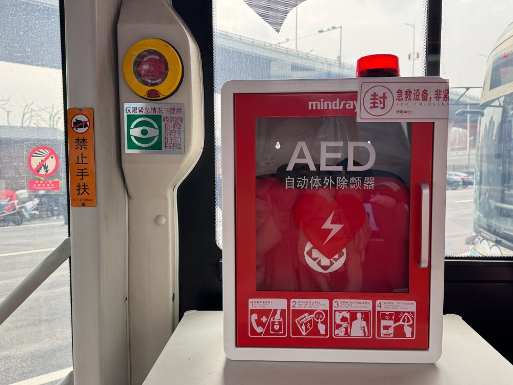 所有主题专线车辆均配备可触摸智能屏。市民可通过屏幕使用公交出行服务平台“宁通行”App、观看国家非遗项目宣传视频、访问小蓝鲸积分商城。此外,南京公交在部分主题专线车辆上加装自动体外除颤器(AED)设备,车身外侧设有红色AED标识,便于市民识别与应急使用。
