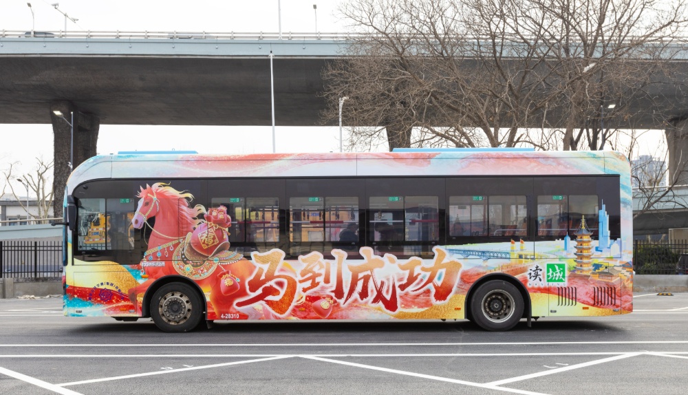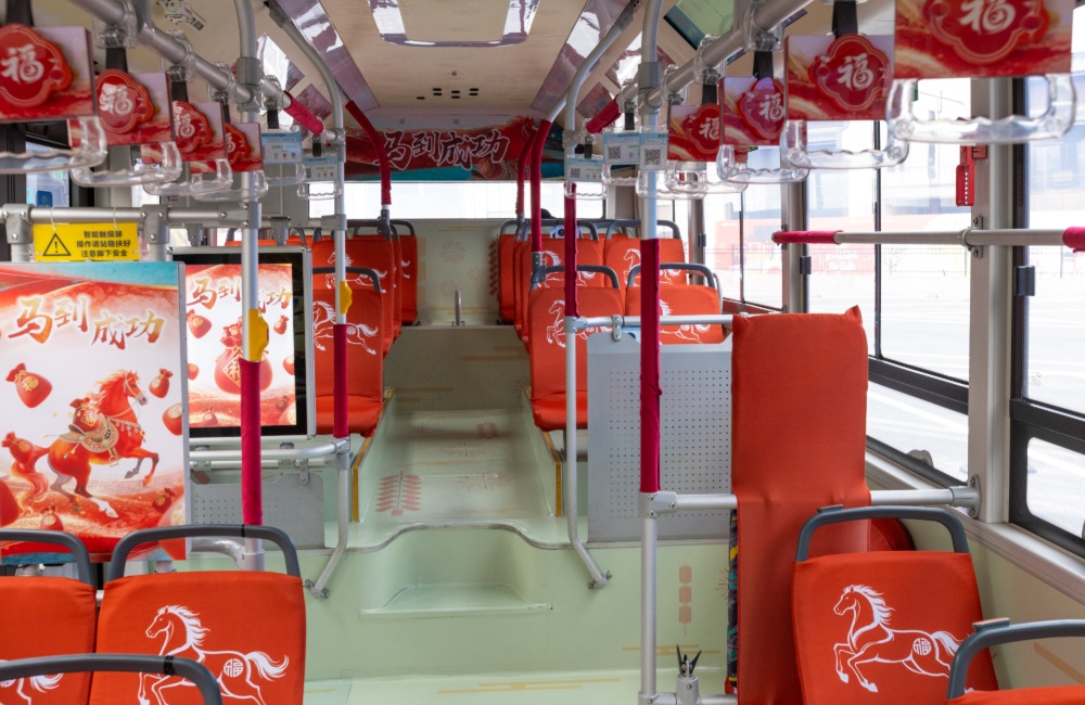 马到成功主题线以传统生肖文化和春节年俗为主题。车身主色调为朱红与暖金,绘有奔腾骏马、福袋、福字等吉祥纹样。车厢内拉手印有“福”字,车头车尾设置立体福袋装饰。南京公交方面表示,该线路旨在通过视觉元素营造节庆氛围,让市民在出行中感受年节气氛。
