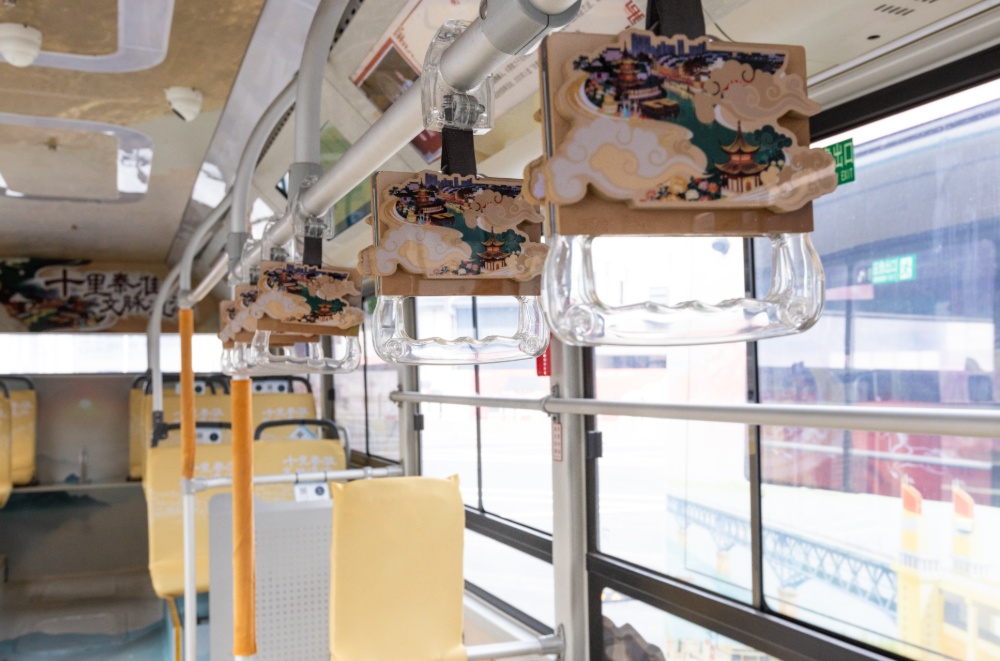 儒家圣迹主题线车身以鎏金色为底,绘制秦淮河画舫、亭台楼阁等景观图案,呈现“十里秦淮”历史风貌。车厢顶部灯箱、拉手等处采用古风装饰,中部灯箱详细展示国家级非物质文化遗产项目介绍。南京公交表示,希望通过车载文化内容,让乘客在通勤途中了解地方曲艺、非遗项目,形成“读城”式体验。