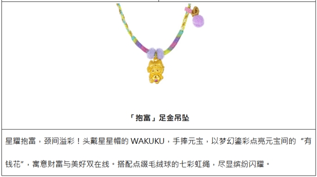 WAKUKU系列涵盖多款萌酷十足的黄金手绳,更特别推出萌暖毛绒手绳与酷感手绳双重选择,满足消费者对个性表达与场景适配的多元需求,风格不设限。萌暖毛绒手绳触感软糯,冬日佩戴温暖舒适,与WAKUKU的可爱气质天然契合,萌力全开!酷感手绳主打简约利落,清爽质感更凸显黄金串饰本身的精致工艺与闪耀光泽,时尚百搭!多款串饰还可自由组合,混搭叠戴。单戴时,祝愿福运聚焦,心意纯粹;叠戴时,祈望福气串联,美好加倍,做到“潮趣由你定义,祝福好运随心叠加”。