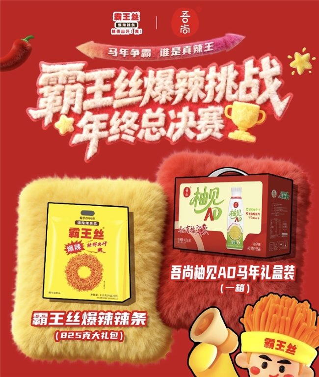 当休闲零食霸王丝爆辣辣条的劲爽口感,遇上吾尚柚见AD马年礼盒装饮品的轻盈活力,碰撞出意想不到的味觉火花。这对组合专为追求新鲜体验的年轻人群打造,用一份“霸气”小食与一瓶健康饮品,为新春假期注入满满能量与乐趣。