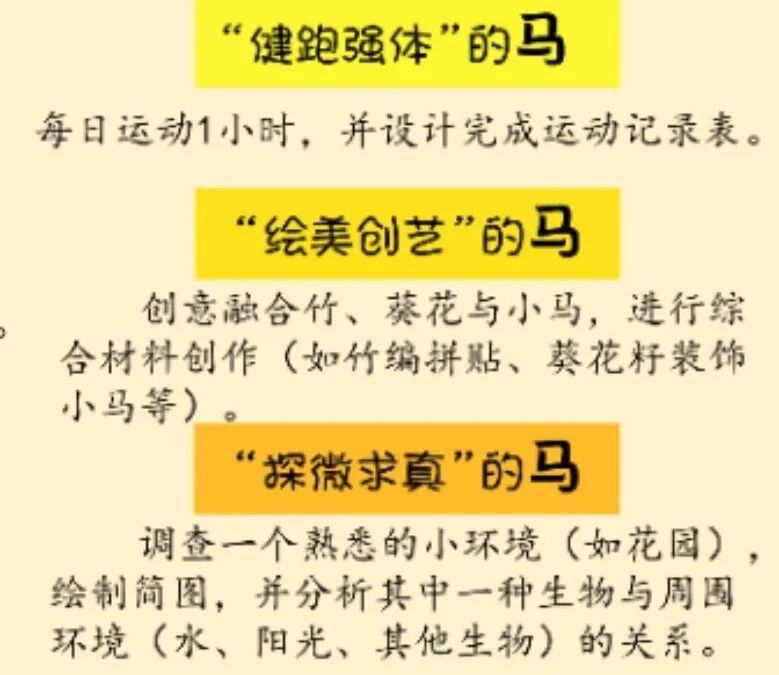 本次寒假特色作业以马年生肖为脉络,将传统年俗文化与项目化学习深度结合。低年级学生通过“学思融通”“乐绘创艺”等任务,在手绘小马福字、探究动物保暖奥秘中,感受传统与自然的交融;中高年级学生则在“爱读会说”“善思会算”“融贯五洲”等板块中,解锁AI绘制未来春节、设计野菜安全食谱、编写Scratch马年动画等多元实践,实现语文、数学、英语、科学、艺术等多学科的跨界联动。
