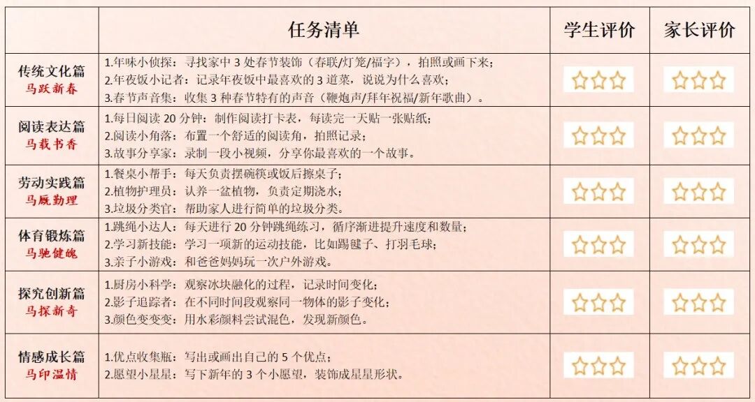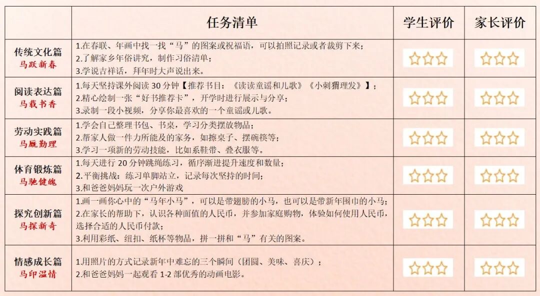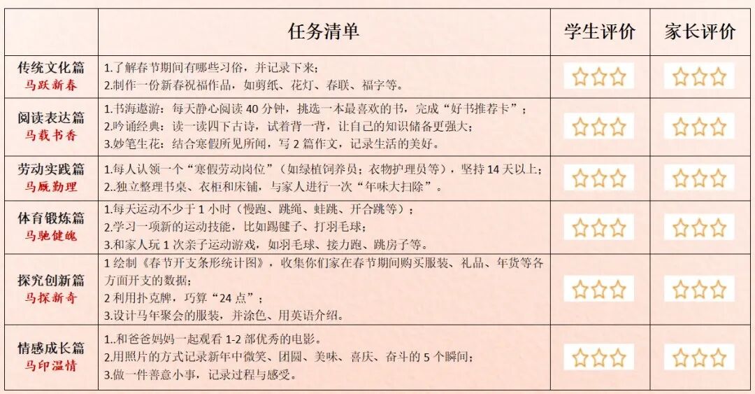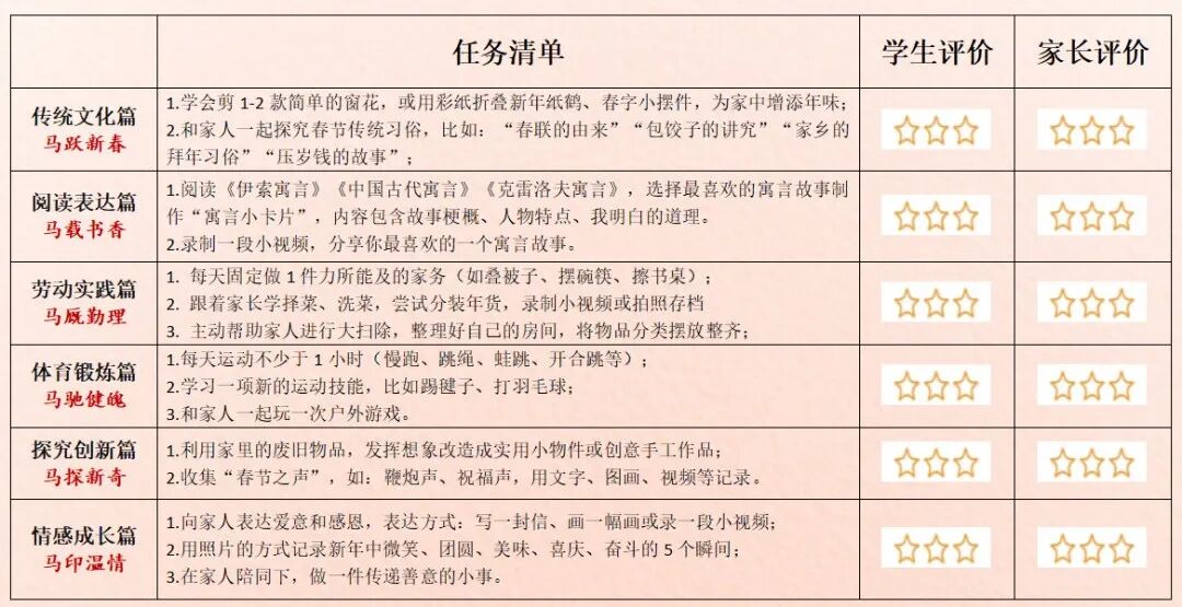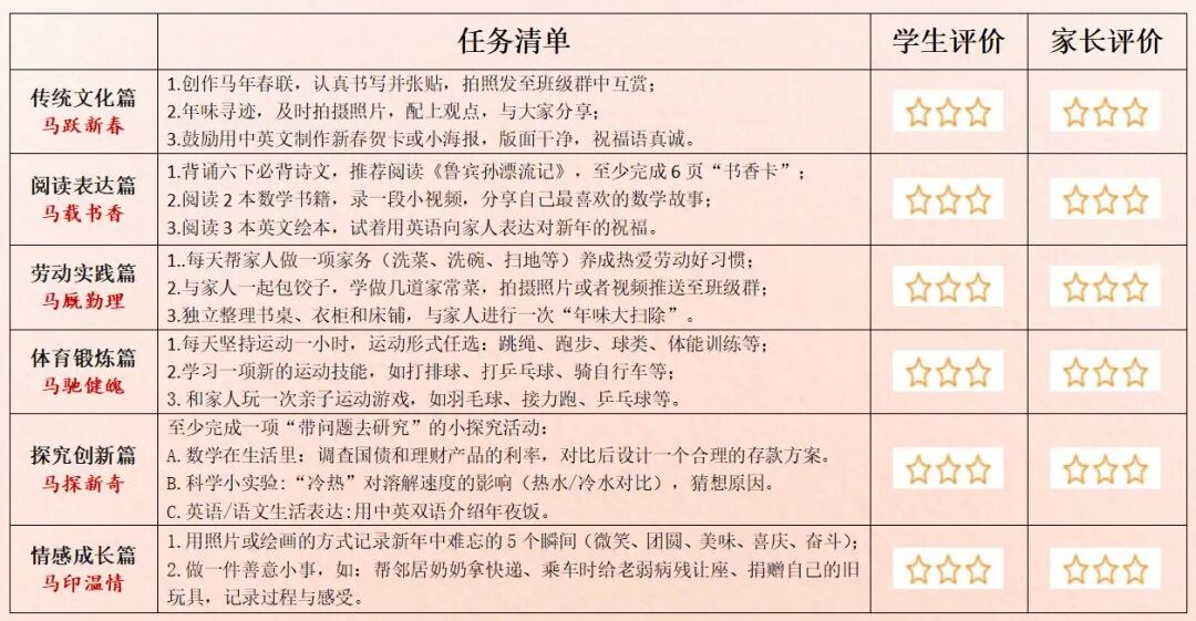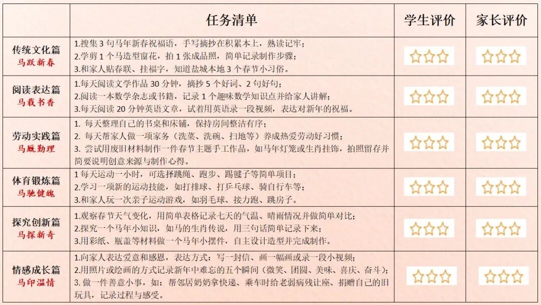 盐城市崇礼路小学教育集团“骏马迎春,躬行致远”寒假特色实践作业分成六个部分,每个年级也都做出了分层要求。比如,第一部分“传统文化篇 · 马跃新春”中,鼓励“年味小侦探”寻找身边的传统印记,动手做一件充满年味的手工,剪一张窗花、做一盏灯笼、写一副春联……在指尖流淌的创意中,感受中华文化的深厚与美好。再比如“劳动实践篇 · 马厩勤理”中,鼓励学生认领一个家庭劳动小岗位,学一项生活新技能,和家人开展“迎新大扫除”,共同布置整洁、温馨的家。