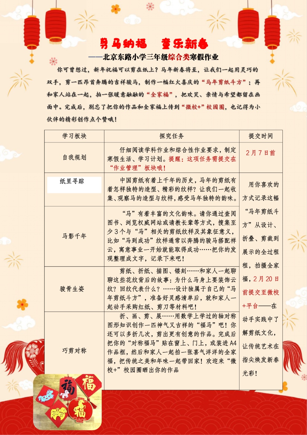 南京市北京东路小学“剪马纳福 童乐新春”三年级综合类寒假作业以马年剪纸为元素,鼓励学生动手动脑进行跨学科实践,感受马年的独特韵味。
