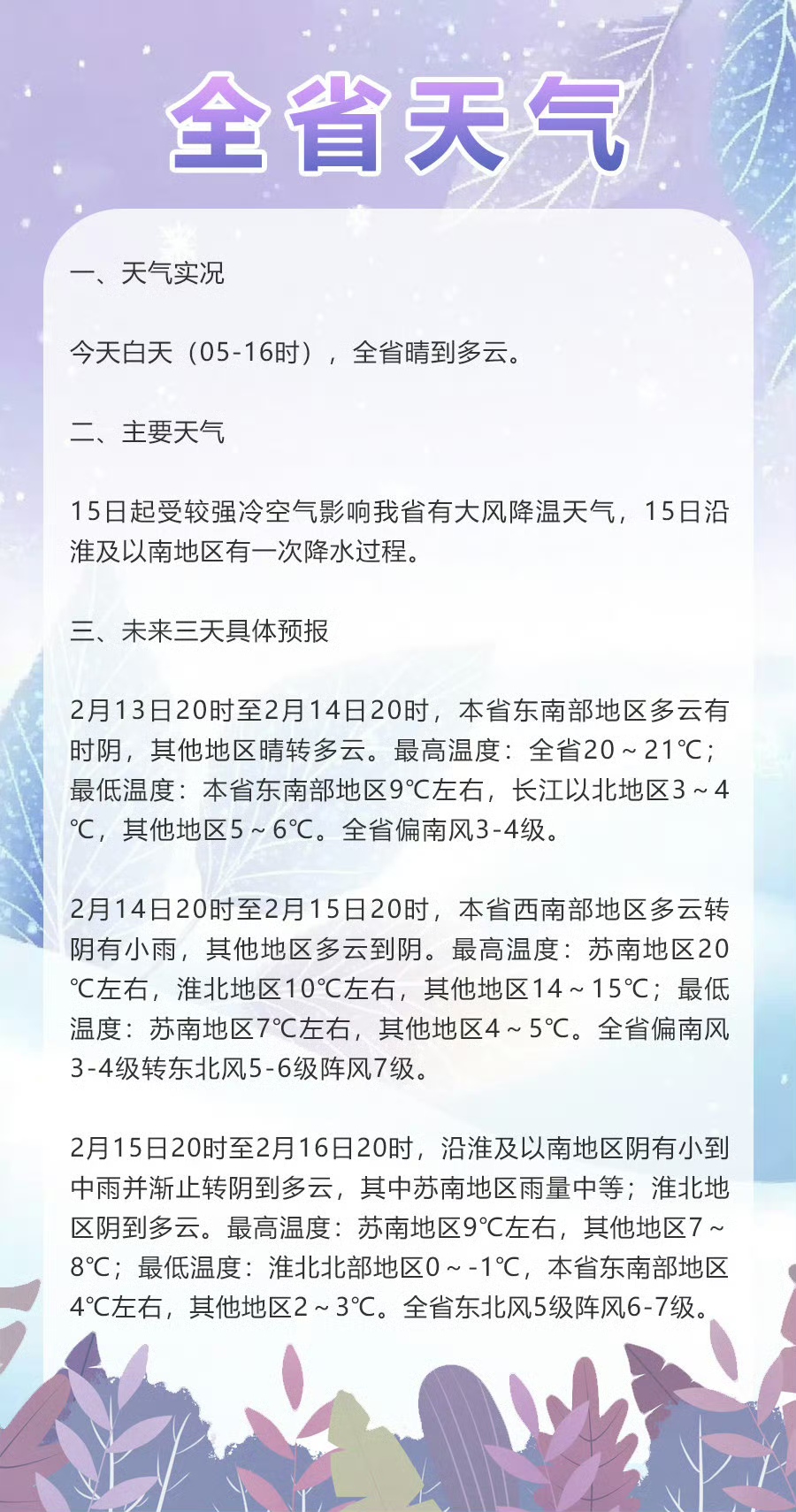 具体预报:2月13日20时至2月14日20时,本省东南部地区多云有时阴,其他地区晴转多云。最高温度:全省20~21℃,最低温度:东南部9℃左右,长江以北3~4℃,其他地区5~6℃。全省偏南风3~4级。2月14日20时至2月15日20时,西南部多云转阴有小雨,其他地区多云到阴。最高温度:苏南20℃左右,淮北10℃左右,其他地区14~15℃;最低温度:苏南7℃左右,其他地区4~5℃。偏南风3~4级转东北风5~6级阵风7级。2月15日20时至2月16日20时,沿淮及以南阴有小到中雨渐止转阴到多云、苏南雨量中等,淮北阴到多云。最高温度:苏南9℃左右,其他地区7~8℃;最低温度:淮北北部0~-1℃,东南部4℃左右,其他地区2~3℃。全省东北风5级阵风6~7级。