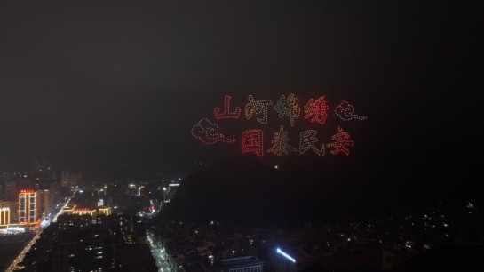 夜幕降临,无人机编队飞行表演点亮紫云夜空。千架无人机以天为幕、以光为笔,变幻出“紫气祥云60载”“我爱紫云”“铸牢中华民族共同体意识”等图案,传统与现代交融、文化与发展互促,为紫云六十华诞献上璀璨礼赞。