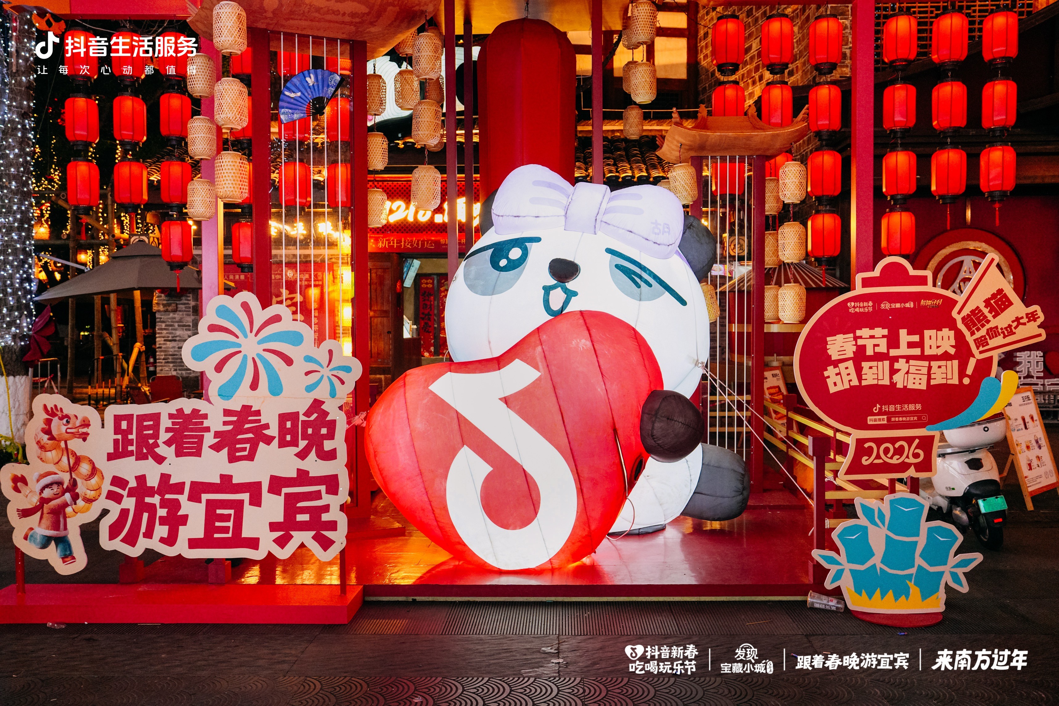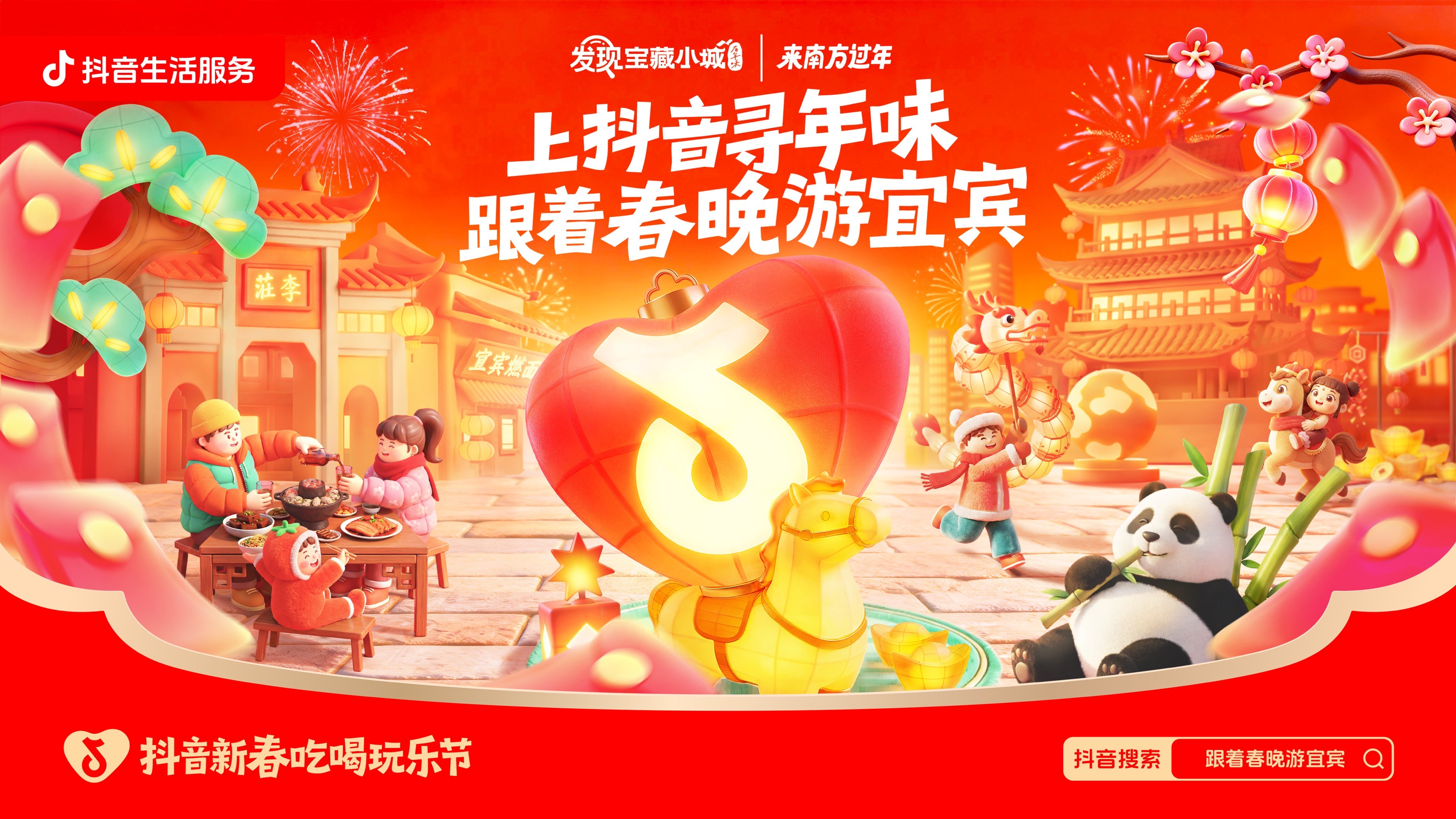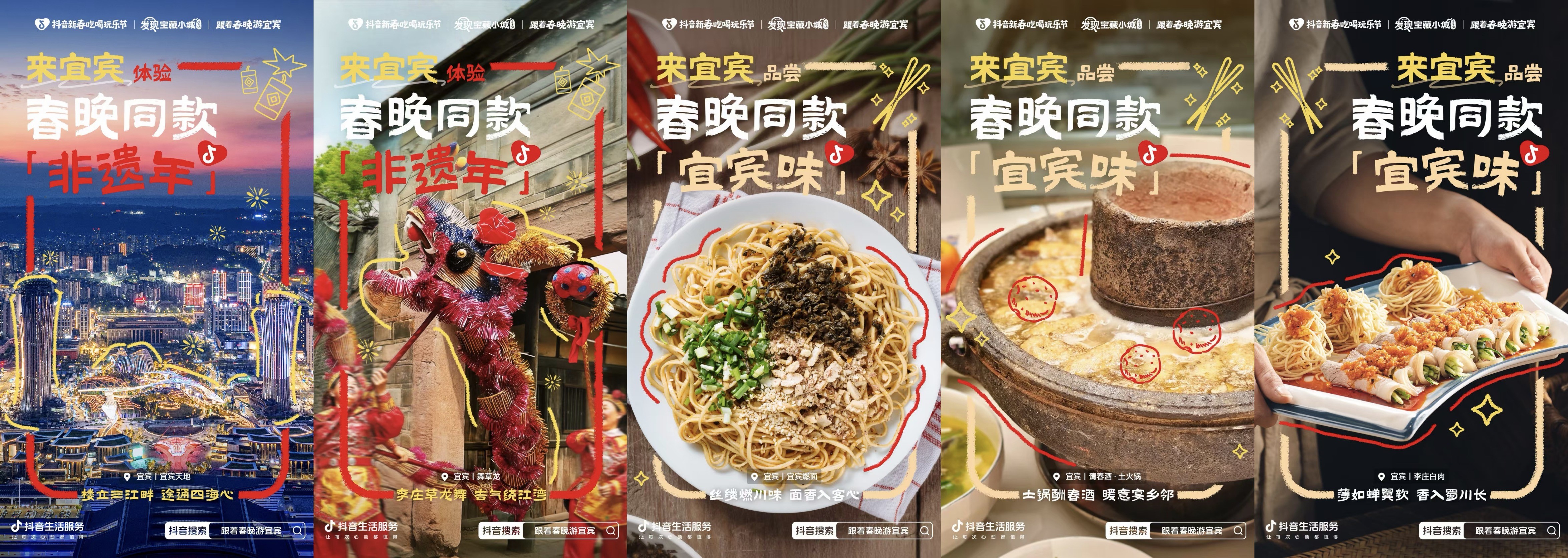 为了让这份热闹不只停留在春晚直播中,抖音生活服务联动央视总台春晚分会场宜宾,落地「跟着春晚游宜宾」活动,联动「抖音新春吃喝玩乐节」「发现宝藏小城」「来南方过年」三大IP,想把天南地北的你们请进来,打卡春晚同款取景地、品尝春晚同款宜宾味、体验春晚同款非遗年。希望你们能在宜宾的宝藏年味中,去触摸、体验最鲜活的中国年,开启马年的全年好运。