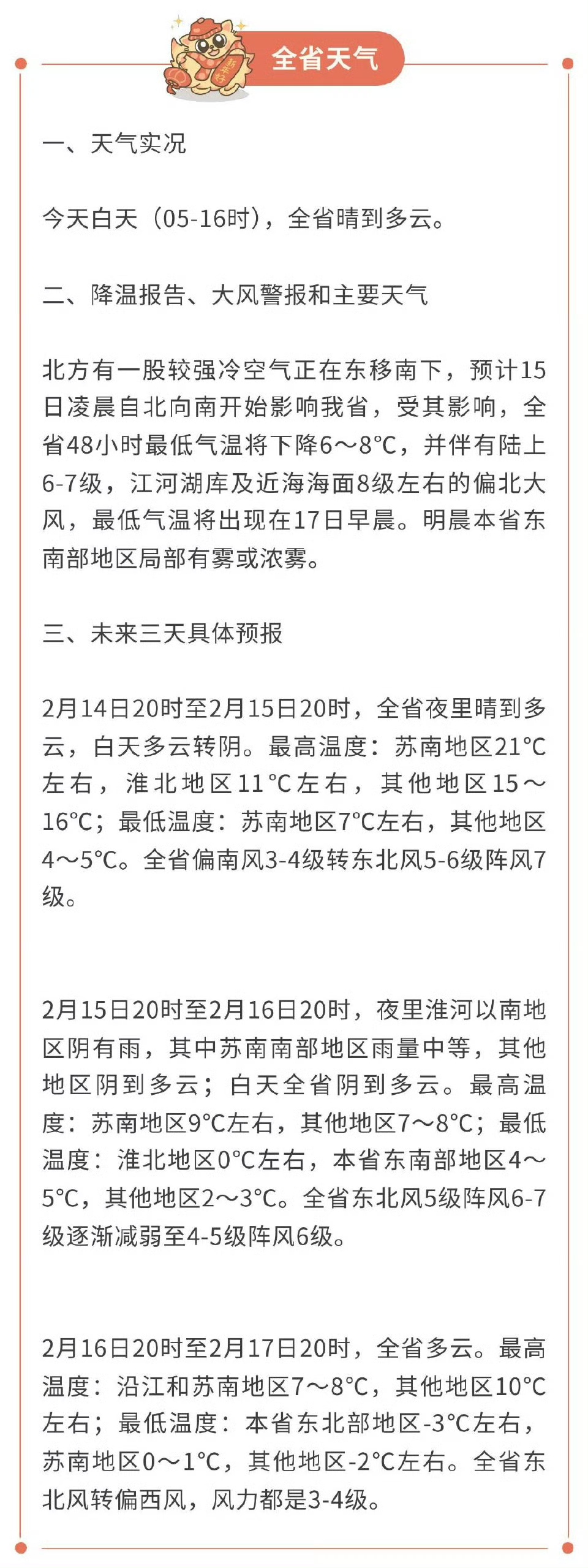 2月15日8时至2月16日8时,淮河以南地区多云转阴有雨,其中苏南地区雨量中等,其他地区阴到多云。最高温度苏南地区20℃左右,淮北地区10℃左右,其他地区14~15℃;最低温度淮北北部地区0~-1℃,本省东南部地区4℃左右,其他地区2~3℃。全省东北风5~6级阵风7级。