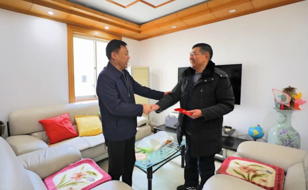 在退休军转干部家中,杨建文与他们亲切交谈,详细询问身体健康状况和家庭生活情况,希望他们传承优良传统和作风,继续发挥余热,为集团高质量发展建言献策、贡献力量。