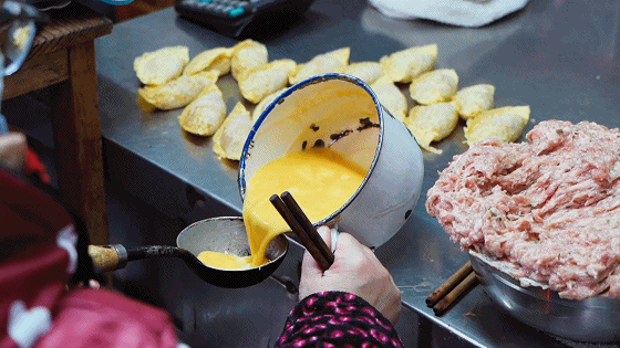将鸡蛋液摊开,小火烘烤成皮,中间包上肉馅,两边一合,一个蛋饺便成型了。