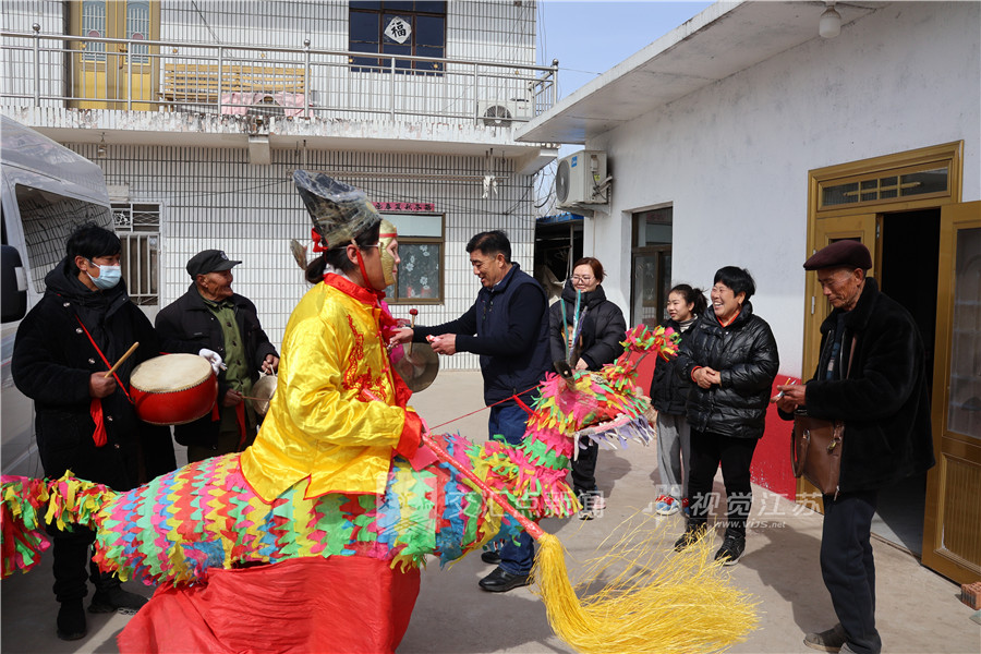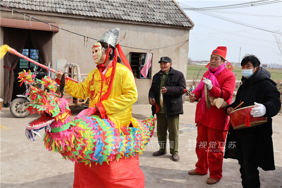(特约摄影 王华 11:58摄 13:05上线)2月16日,连云港市灌南县田楼镇浦二庄村,民间艺人正在村民家门前跳麒麟欢庆马年春节。每年春节,当地民间艺人就会用竹篾或芦柴开始制作麒麟,给新春佳节增添喜庆色彩。