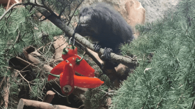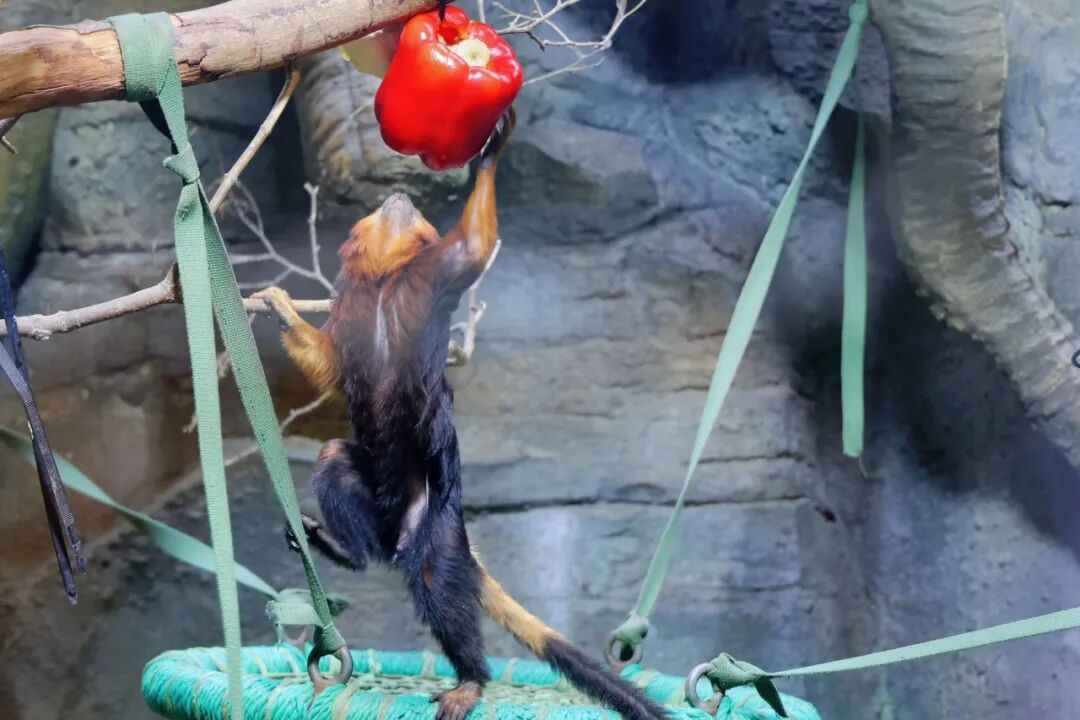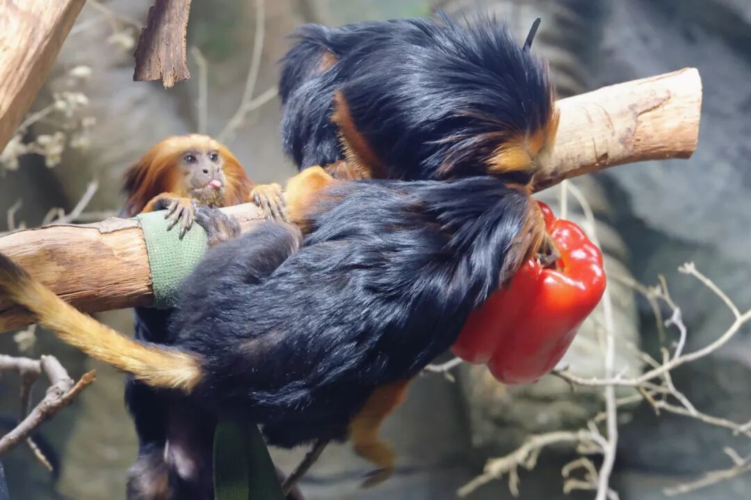 凑近闻一闻,伸出小爪子戳一戳,再挤在一起“吱吱”叫,金头狮面狨表现出对灯笼椒由衷的喜爱。