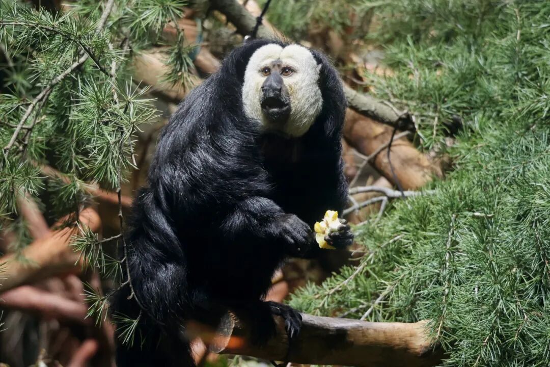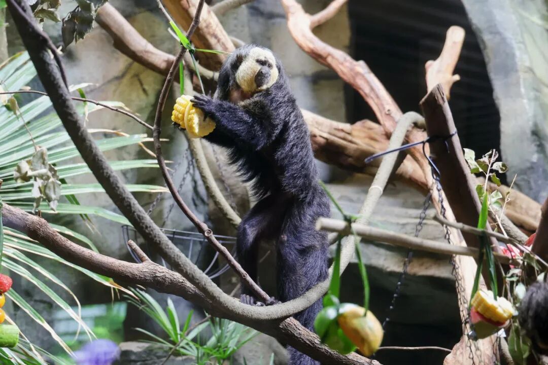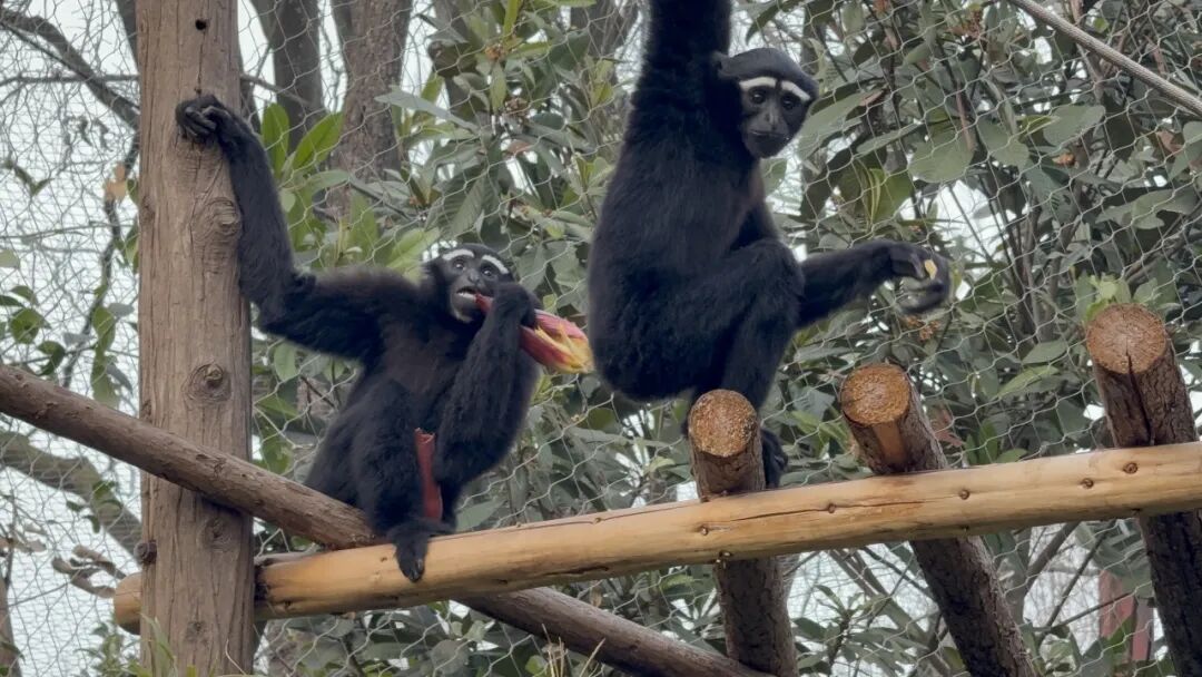 亚洲灵长馆的年夜饭丰盛、多样、有排面。白眉长臂猿长臂一甩,轻轻松松抓住芭蕉花,往嘴边一送,动作行云流水。