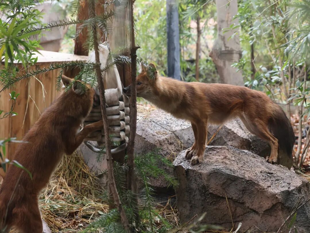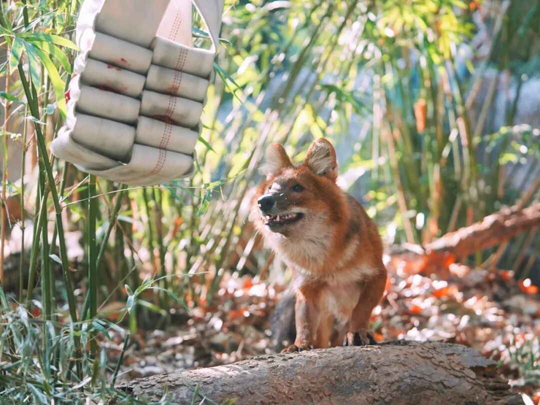 豺面对饲养员准备的“叠叠丰容”,既谨慎又好奇。