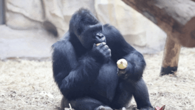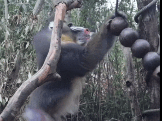 山魈“聪聪”有的是力气,面对略带结实的椰子丰容,锲而不舍,成功吃到里面的坚果。