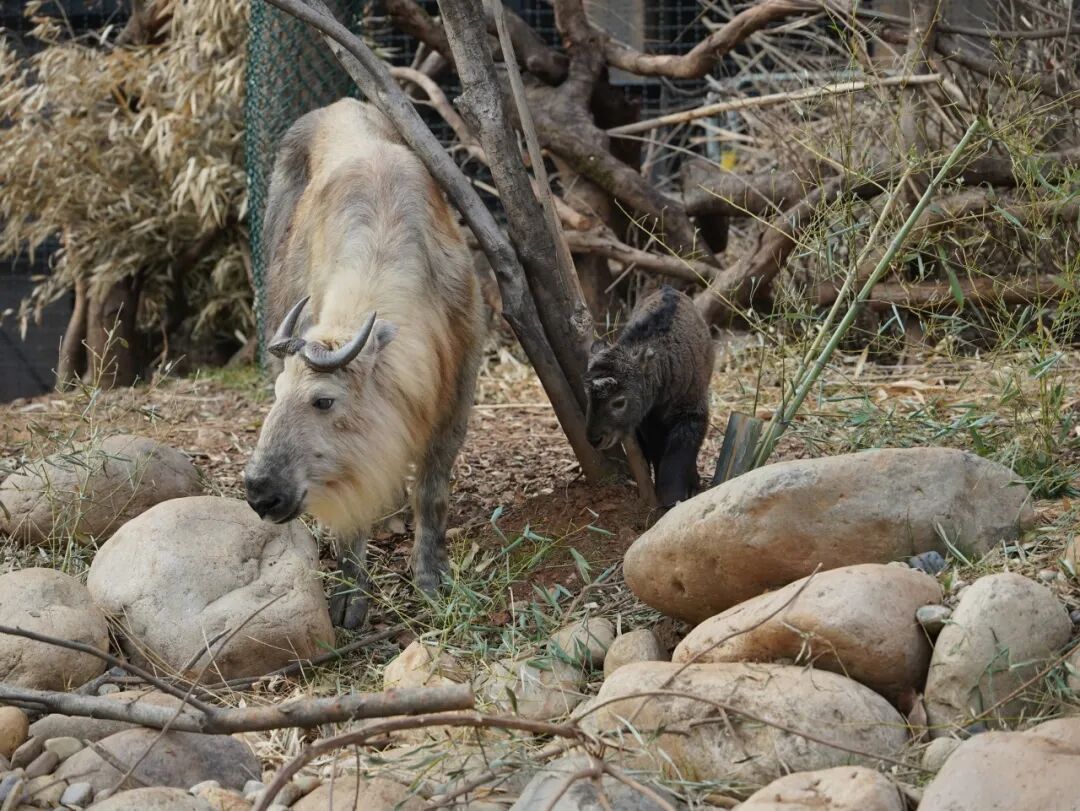 刚出生一周的羚牛宝宝也跟着妈妈吃上了年夜饭。羚牛宝宝还处在喝奶阶段,只能用叶子磨磨小牙齿。