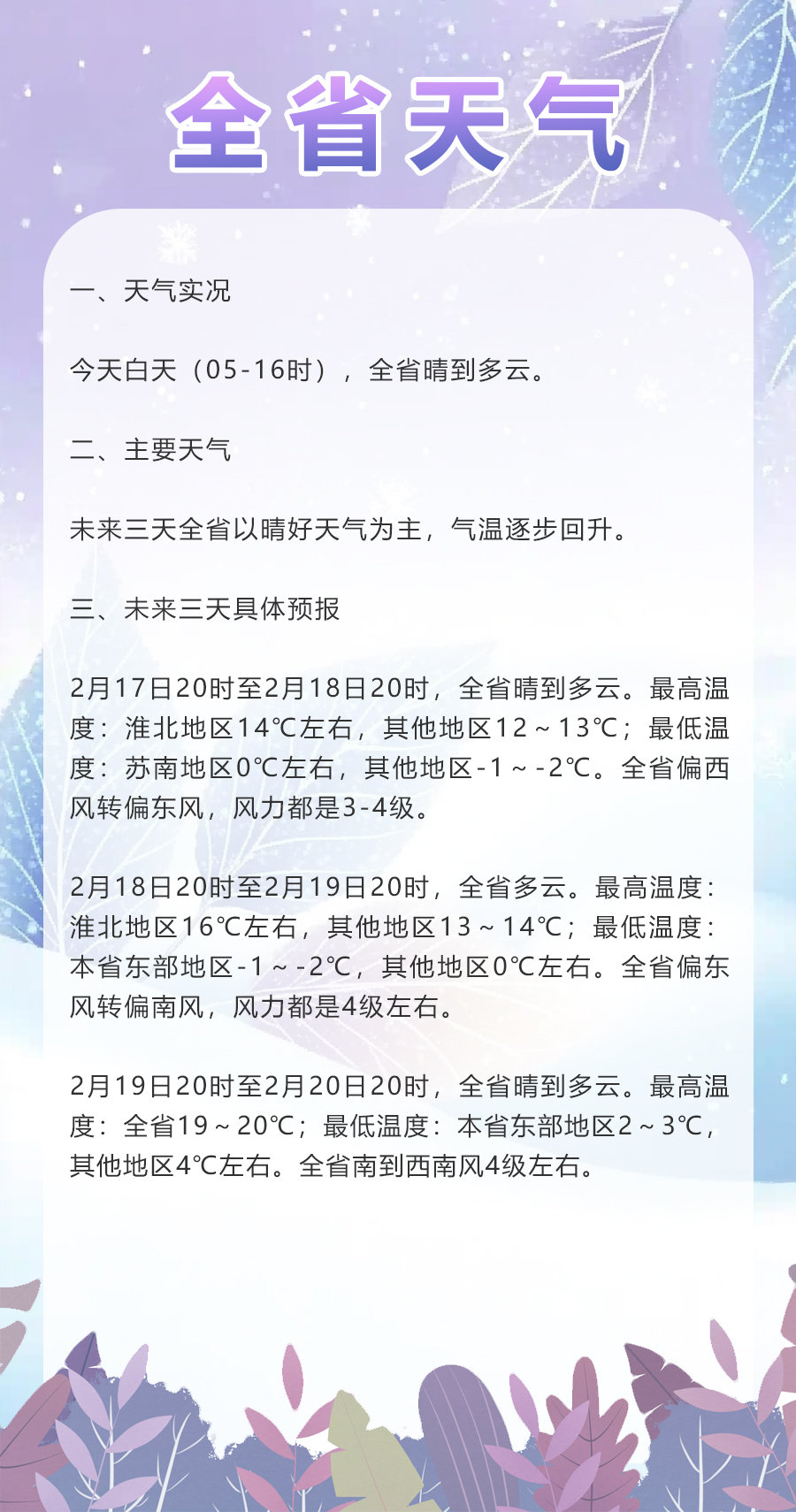2月17日20时至2月18日20时全省晴到多云,最高温度淮北地区14℃左右,其他地区12至13℃,最低温度苏南地区0℃左右,其他地区-1至-2℃,全省偏西风转偏东风,风力3至4级。