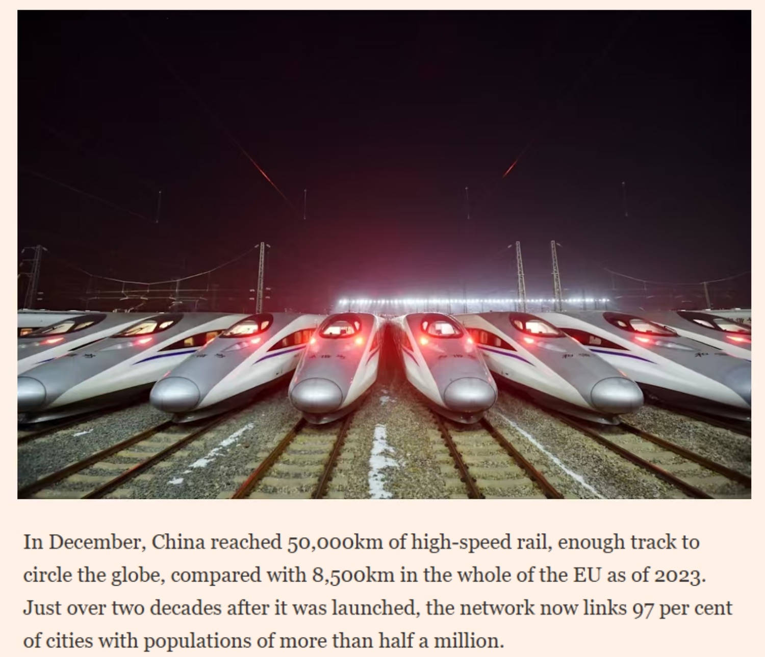 报道还关注到,2025年12月,中国高铁运营里程突破5万公里,足以绕地球一圈。相比之下,截至2023年,整个欧盟的高铁里程为8500公里。如今,中国高铁网络覆盖了97%的50万人口以上城市,而这项工程启动至今不过二十余年。