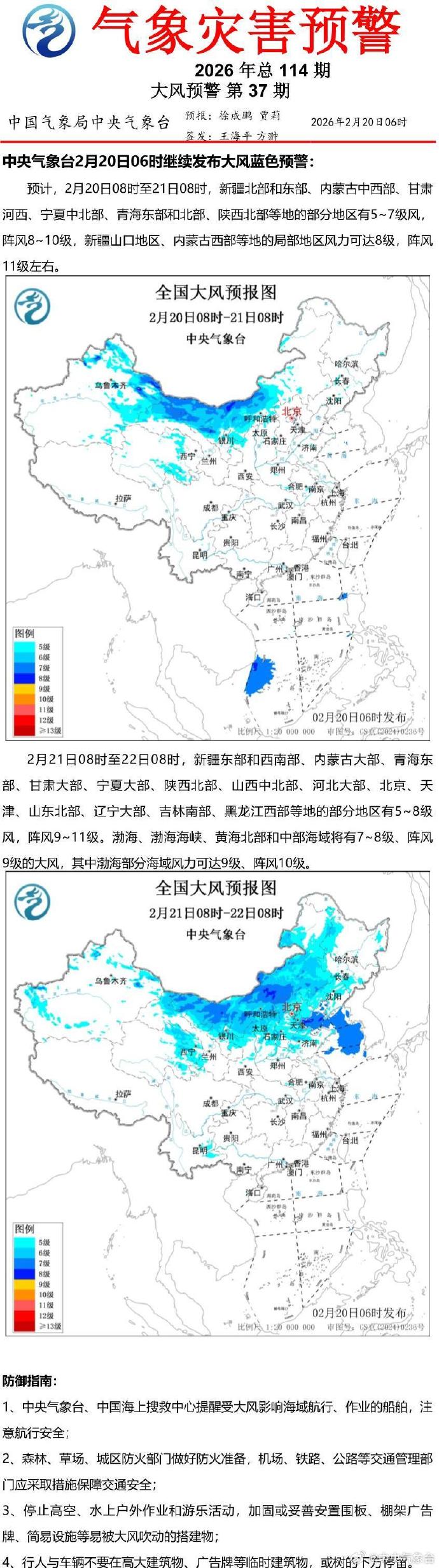中央气象台2月20日06时继续发布大风蓝色预警。