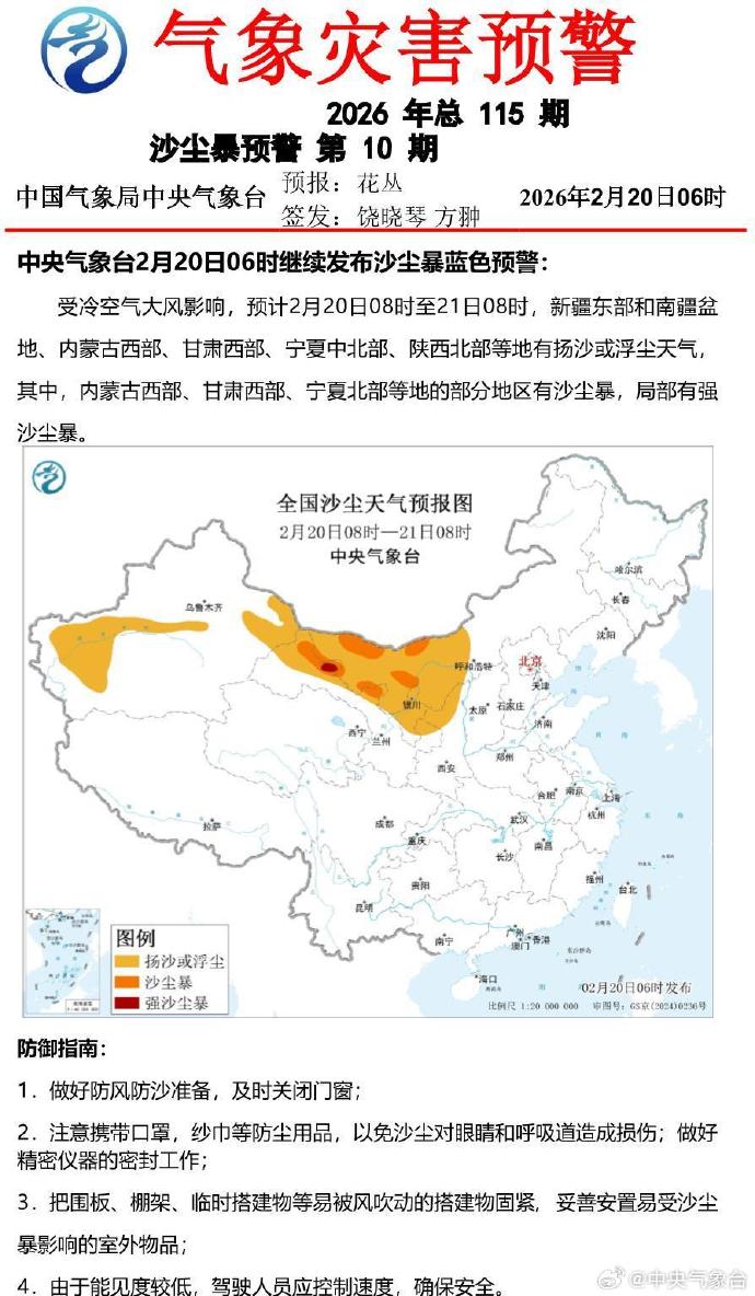 中央气象台2月20日06时继续发布沙尘暴蓝色预警。