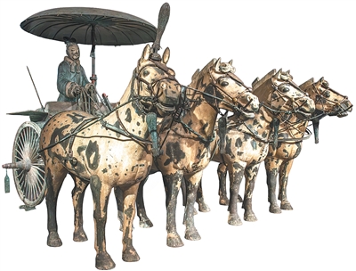 秦始皇陵的青铜马车阵列静静伫立上千年,却仍散发着秦军“车千乘,骑万匹”的磅礴气势。