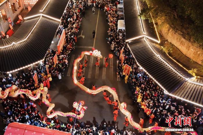 夜渐深,巡游队伍抵达终点,鼓声骤然加快,草龙完成最后一段腾跃,龙头高高扬起,又缓缓落下,围观人群报以掌声与喝彩。