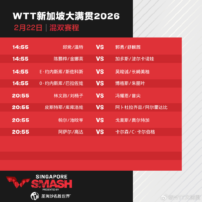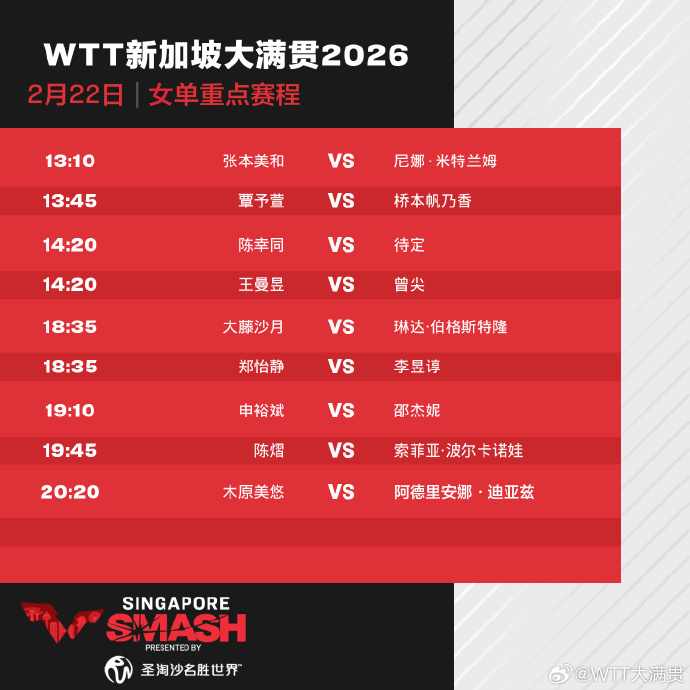 今天(22日),2026年WTT新加坡大满贯正赛打响,首日国乒8人出战,具体赛程如下: