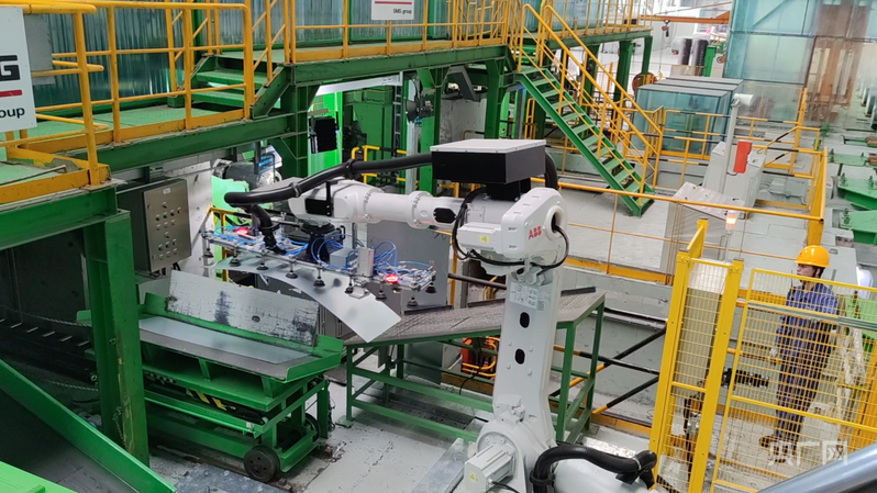 在本钢板材冷轧总厂三冷工序,智能设备正将一块钢板放到样板台(央广网发 本钢集团供图)
