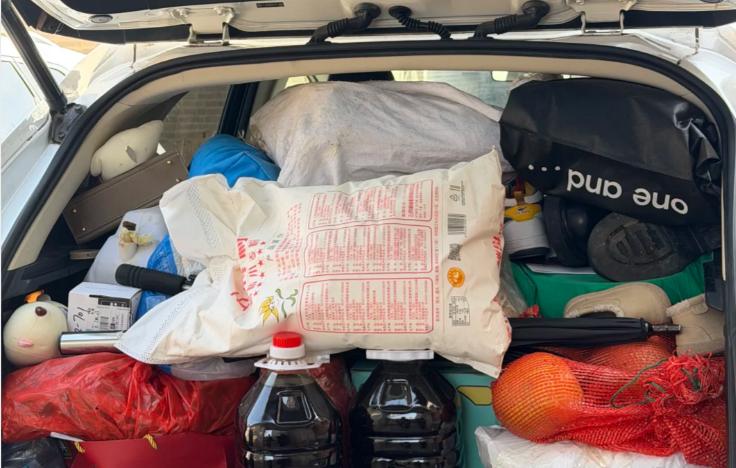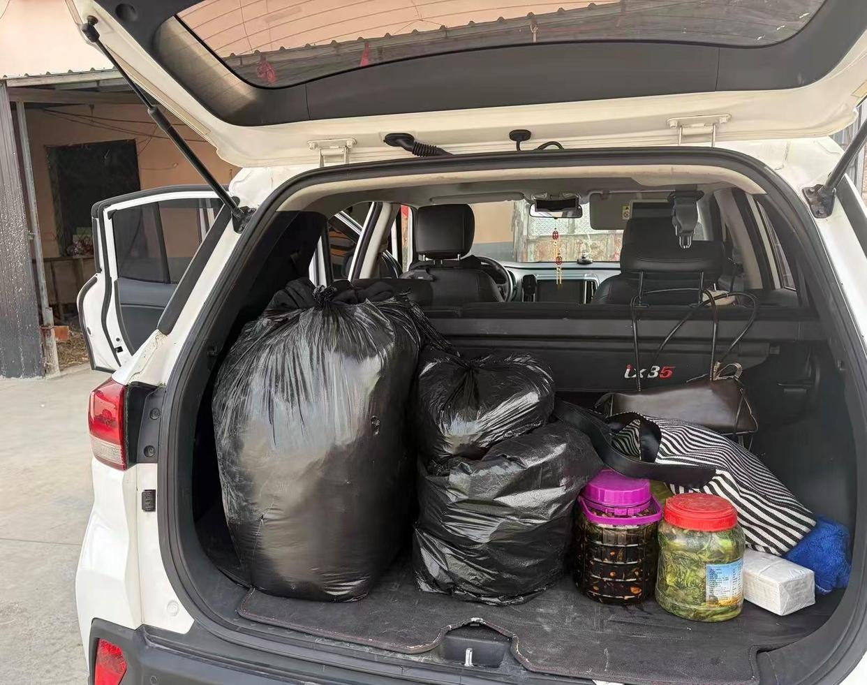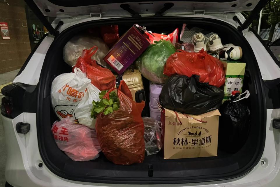 谁懂啊!后备箱一打开,全是爸妈塞的“爱意超载”,各种袋子装的干货、零食……甚至连雨伞、鞋子都给备上了,生怕我在外面吃不好、用不好。