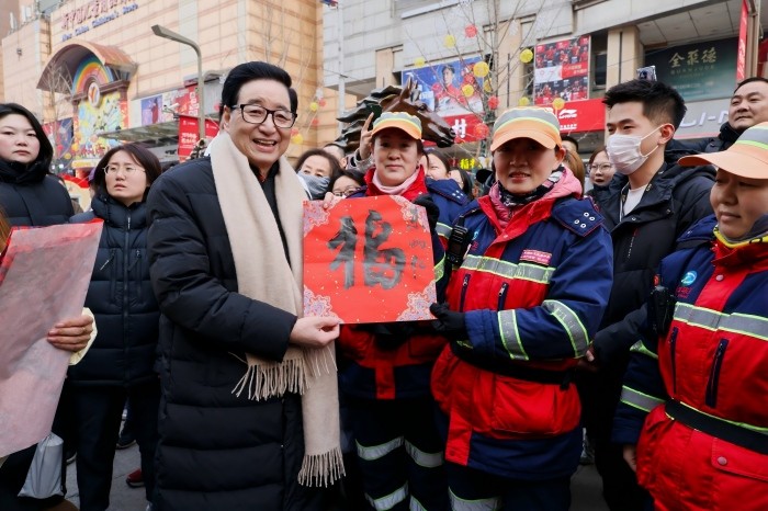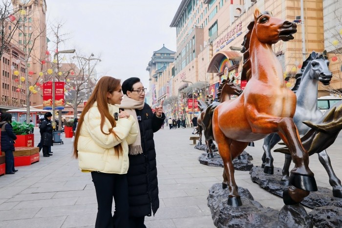 随后,一行人来到王府井大街,长达13米的大型公共艺术品《王府八骏》巍然矗立,朱炳仁感慨道:“看到一马当先,就想到万马奔腾,群体的力量才能走得更远。”在浓郁的墨香中,朱炳仁手持“福”字,为来往市民和游客送上新春祝福。
