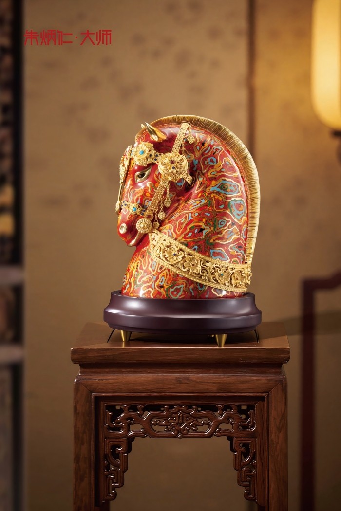 朱炳仁介绍,亮相央视的马年生肖吉祥物,每一件都兼具匠心与深意,尽显新时代昂扬气象。其中,《马富贵》作为朱炳仁、朱军岷“新时代十二兽首”开篇之作,灵感源自圆明园十二生肖兽首。作品首次采用雕金大漆工艺融合多项非遗技艺,重工重彩间尽显华贵与厚重,以“仁彩”重塑国宝收藏新高度。